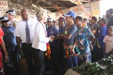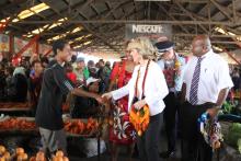 Minister for Foreign Affairs Julie Bishop greets vendors and customers at Lae Market, Papua New Guinea, during a walking tour with officers from the Australian Federal Police and the Royal Papua New Guinea Constabulary (RPNGC), who are working together to strengthen the RPNGC’s ability to deliver effective and visible policing services for the people of PNG.