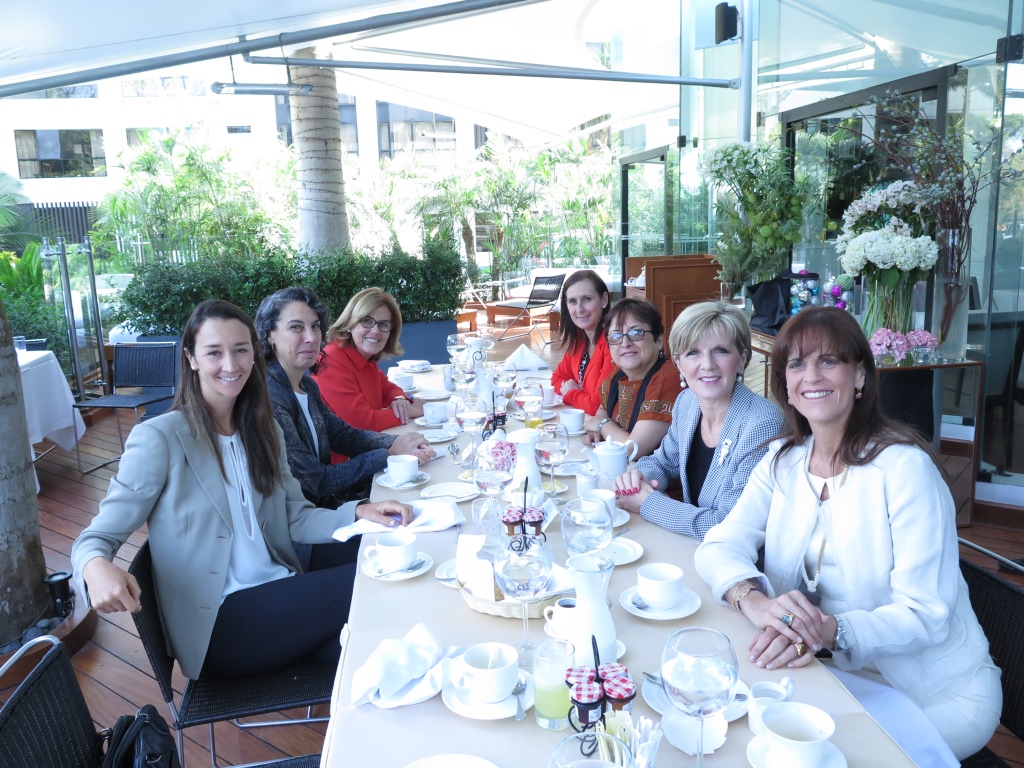 The Hon Julie Bishop’s breakfast with influential Peruvian women: left: Dancer Vania Masias; Researcher and former Minister for Development and Social Inclusion, Carolina Trivelli; journalist Monica Delta; businesswoman and director of APEGA, Patricia Teullet; National Director of Museums, Sonia Guillen; Minister Bishop and celebrity chef and businesswoman, Sandra Plevisani. 10 December 2014.
