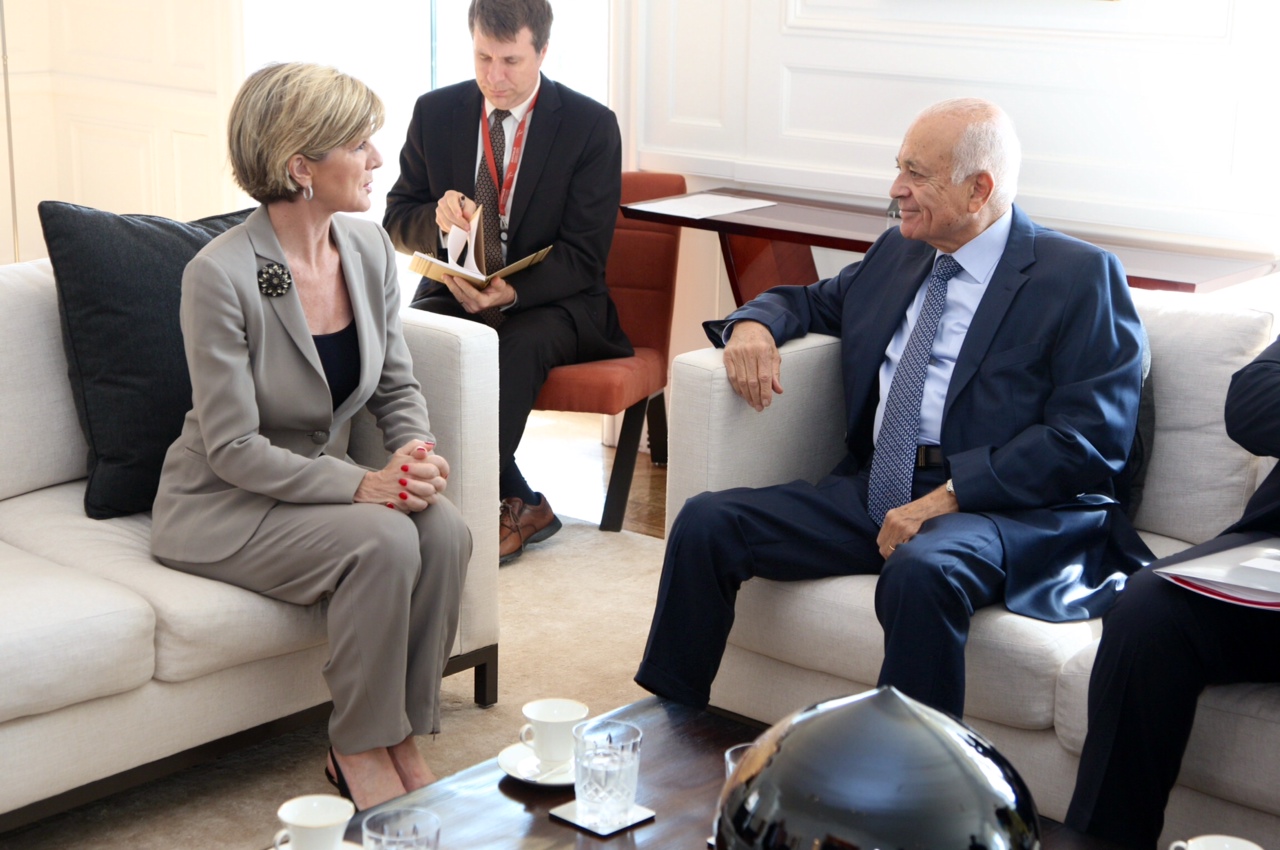 Foreign Minister Julie Bishop meets with H.E. Dr Nabil Elaraby, Secretary-General of the League of Arab States in New York on 20 September, 2014.