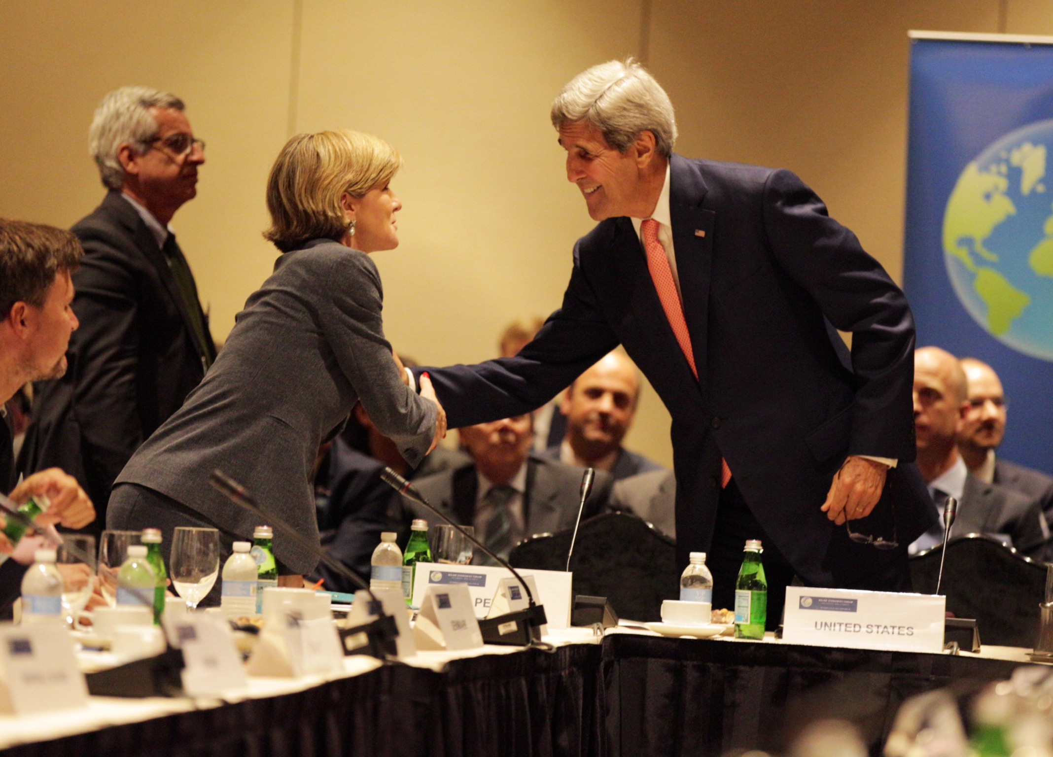 Foreign Minister Julie Bishop greets United States Secretary of State, John Kerry at a meeting of the Major Economies Forum in New York, 21 September, 2014. (Trevor Collens/DFAT).