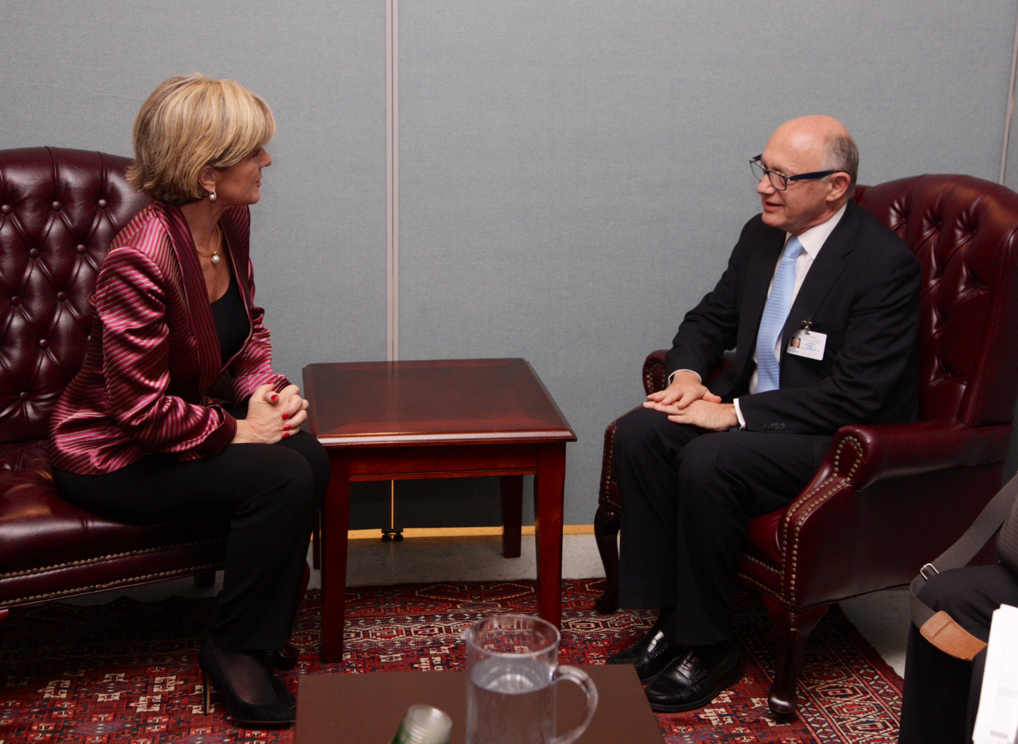 Foreign Minister Julie Bishop meets with HE Hector Marcos Timerman, Minister of Foreign Affairs and Worship of the Argentine Republic, at the United Nations in New York, on 22 September 2014. (Trevor Collens/DFAT).