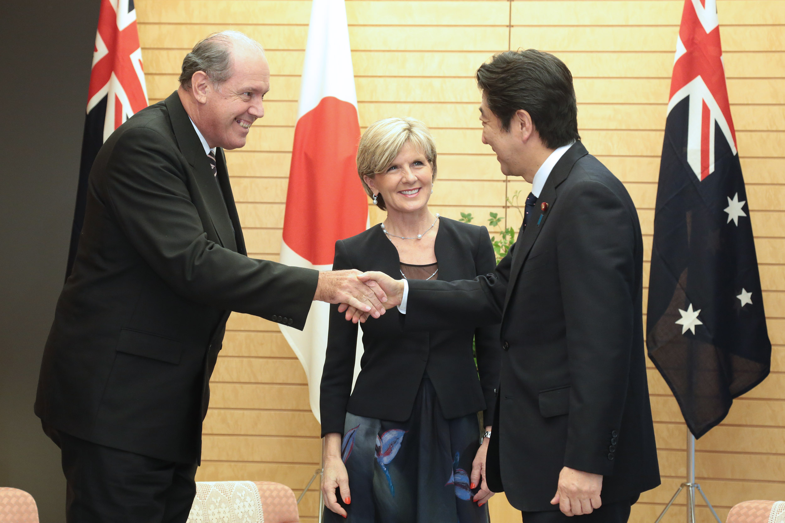 Senator the Hon David Johnston, Minster for Defence, the Hon Julie Bishop MP, Minister for Foreign Affairs, and Japanese Prime Minister, Mr Shinzo Abe shaking hands at a meeting at the Prime Minister's official residence.