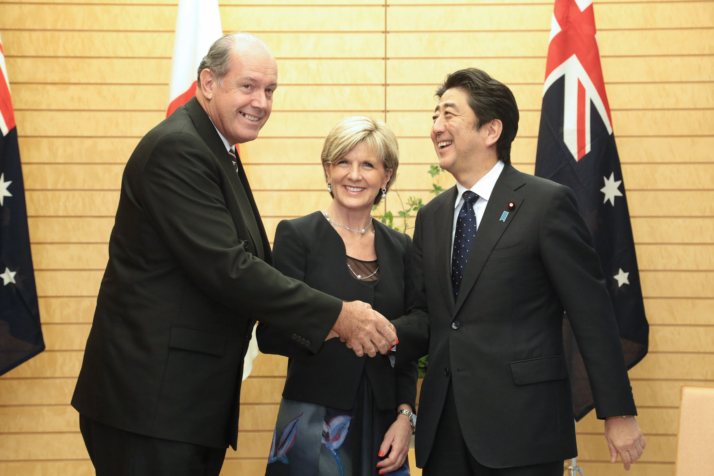 Senator the Hon David Johnston, Minster for Defence, the Hon Julie Bishop MP, Minister for Foreign Affairs, and Japanese Prime Minister, Mr Shinzo Abe shaking hands at a meeting at the Prime Minister's official residence.
