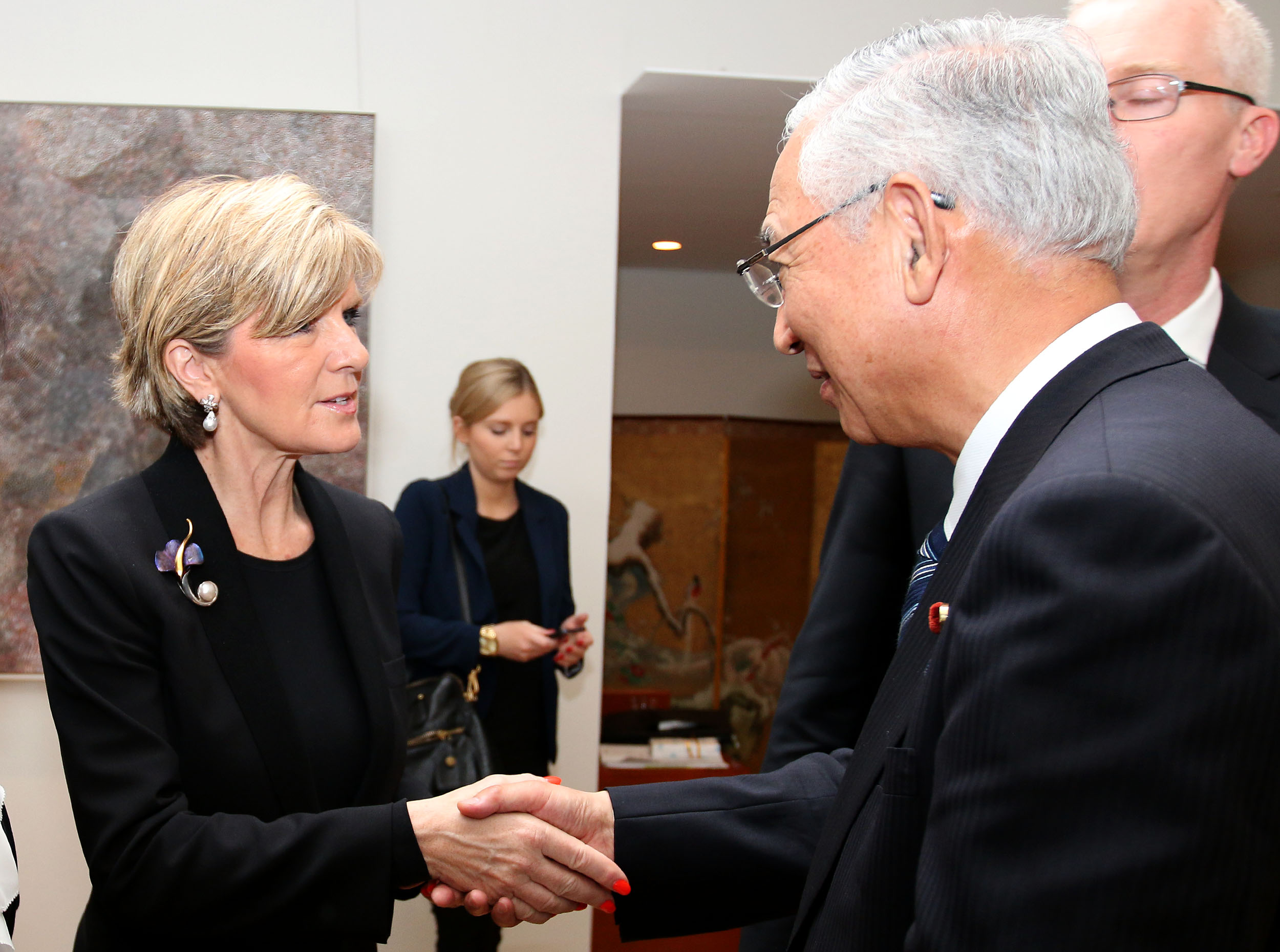The Hon Julie Bishop MP, Minister for Foreign Affairs speaking with Mr Yoshihisa Inoue, Secretary General New Komeito Party.
