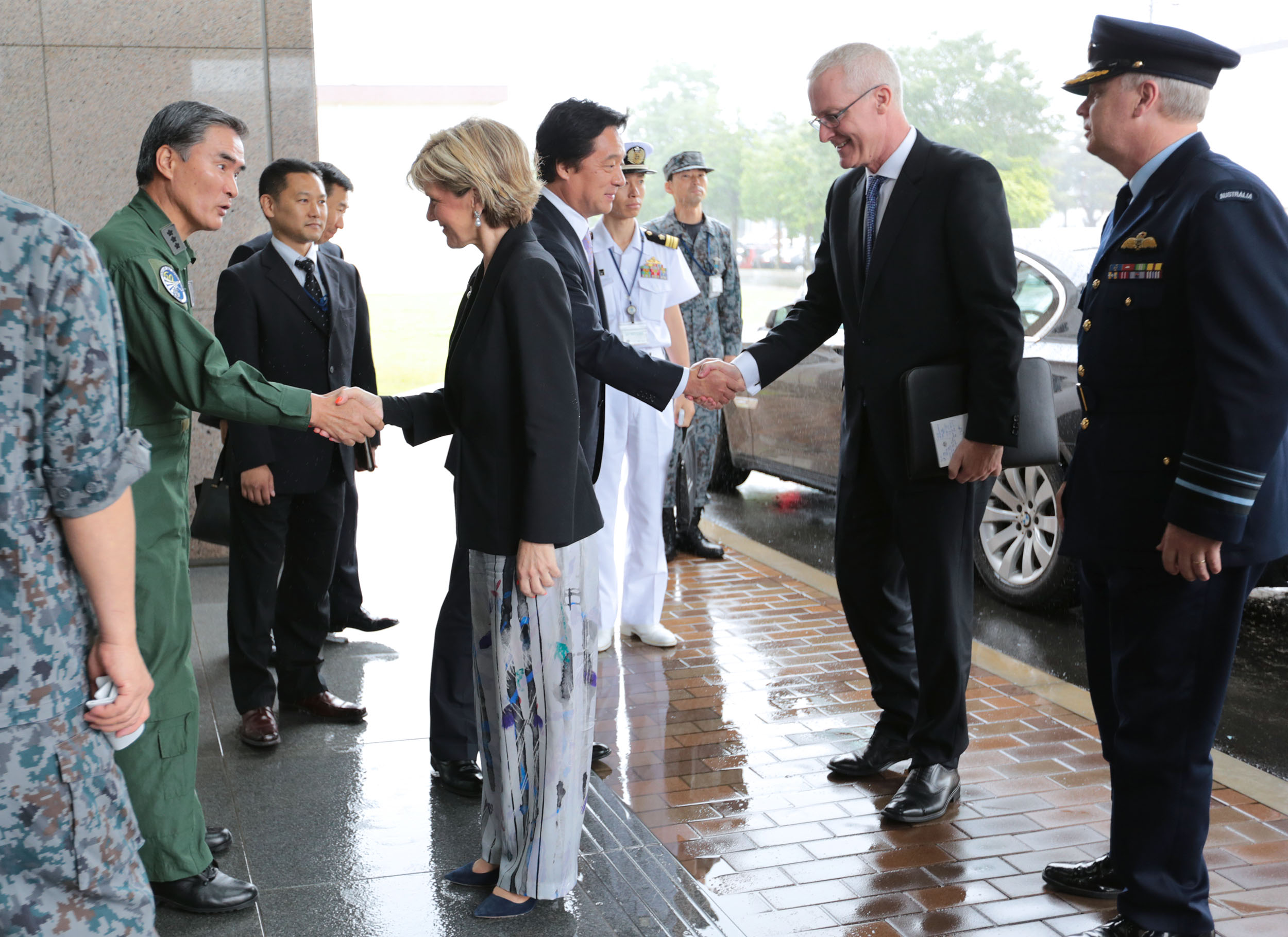 The Hon Julie Bishop MP, Minister for Foreign Affairs, greeted by Lieutenant General Nakashima, Commander Air Defence Command, and Mr Wakamiya, Parliamentary Vice Minister of Defense greeting HE Mr Bruce Miller, Australian Ambassador to Japan on arrival to Japan Air Self Defence Force Air Defence Command, Yokota Airforce Base today.