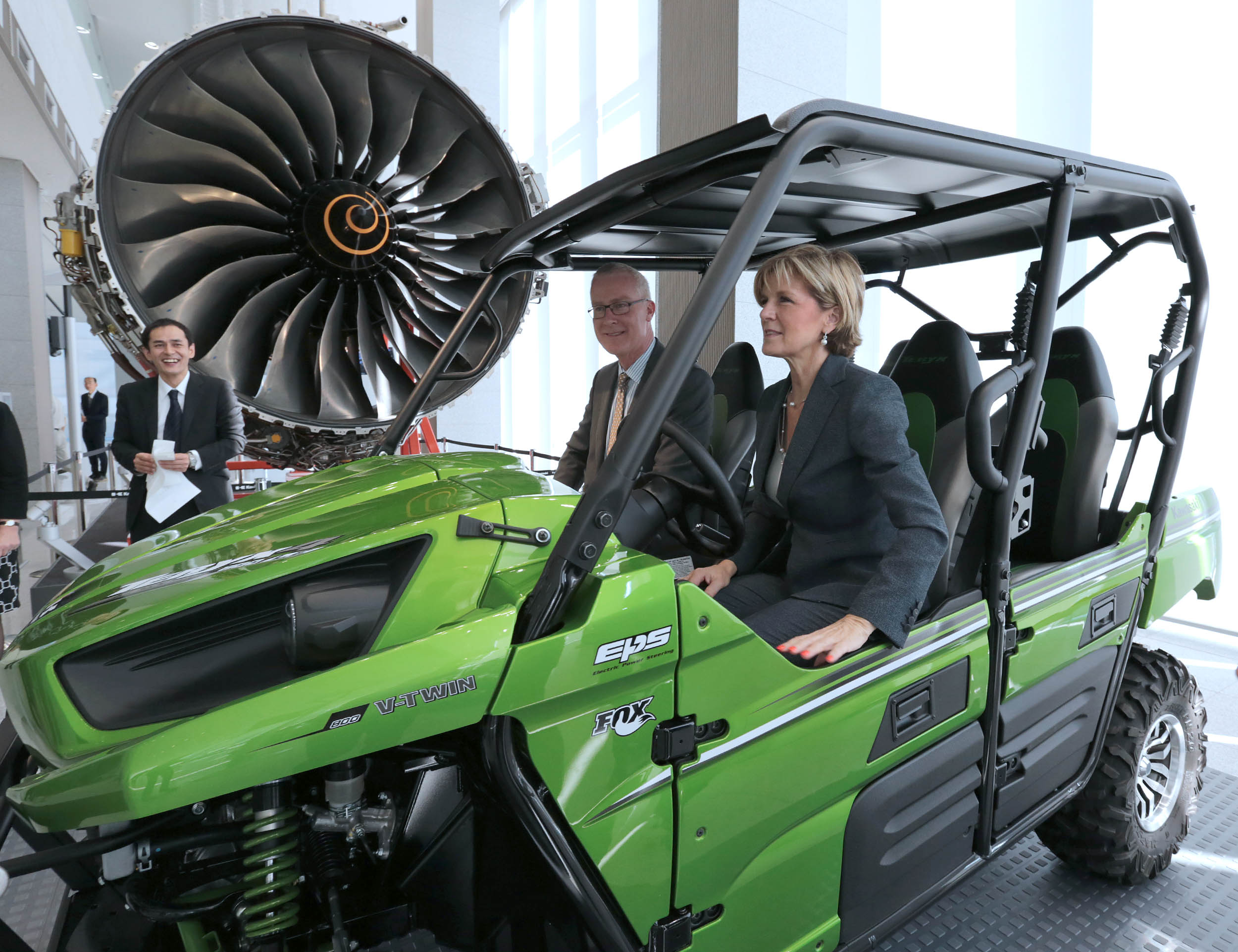 HE Mr Bruce Miller, Australian Ambassador to Japan and the Hon Julie Bishop MP, Minister for Foreign Affairs, test-driving new machinery at Kawasaki Heavy Industries.