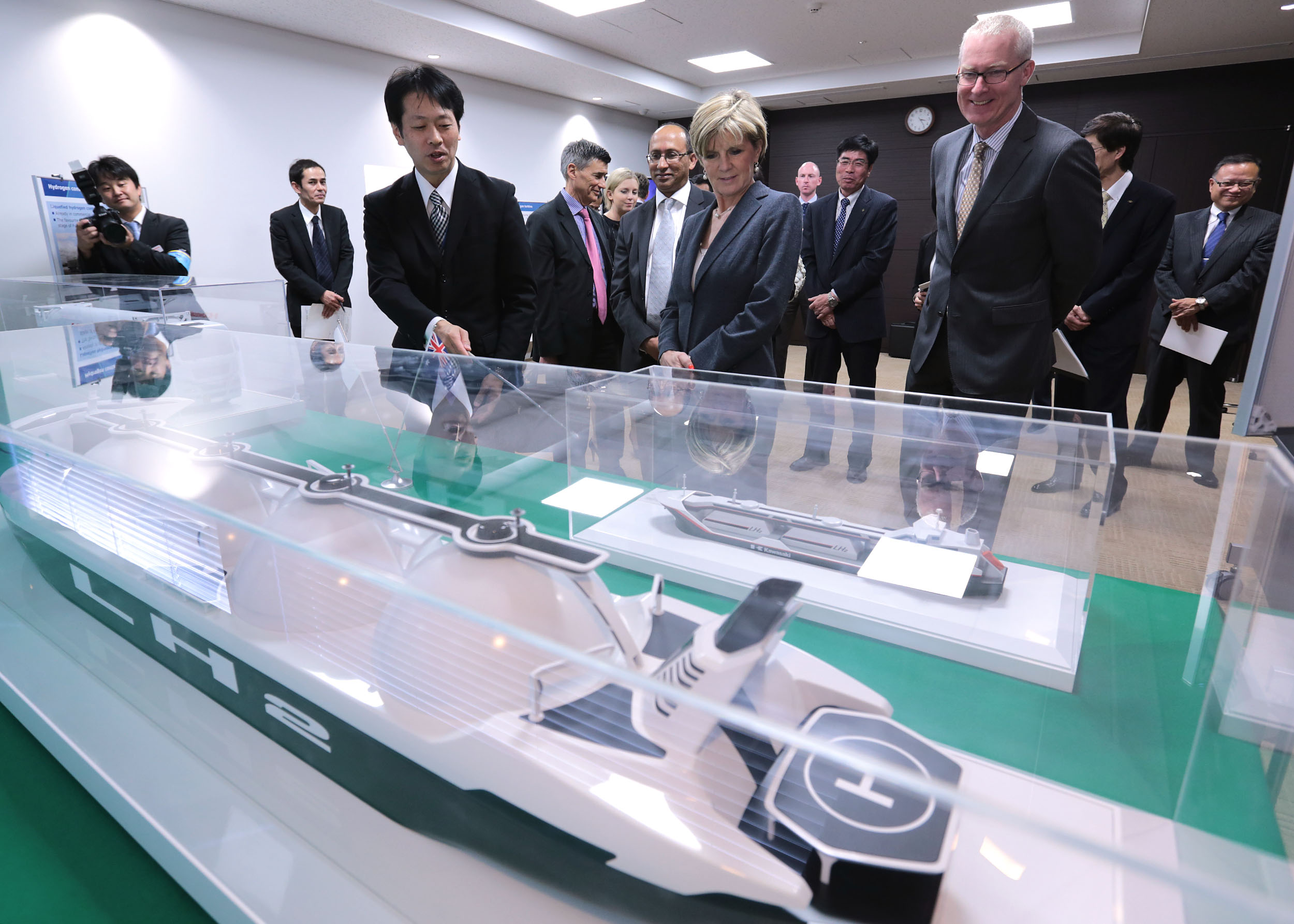 Senior executives from Kawasaki Heavy Industries showing models of new products to the Hon Julie Bishop MP, Minister for Foreign Affairs, and HE Mr Bruce Miller, Australian Ambassador to Japan.