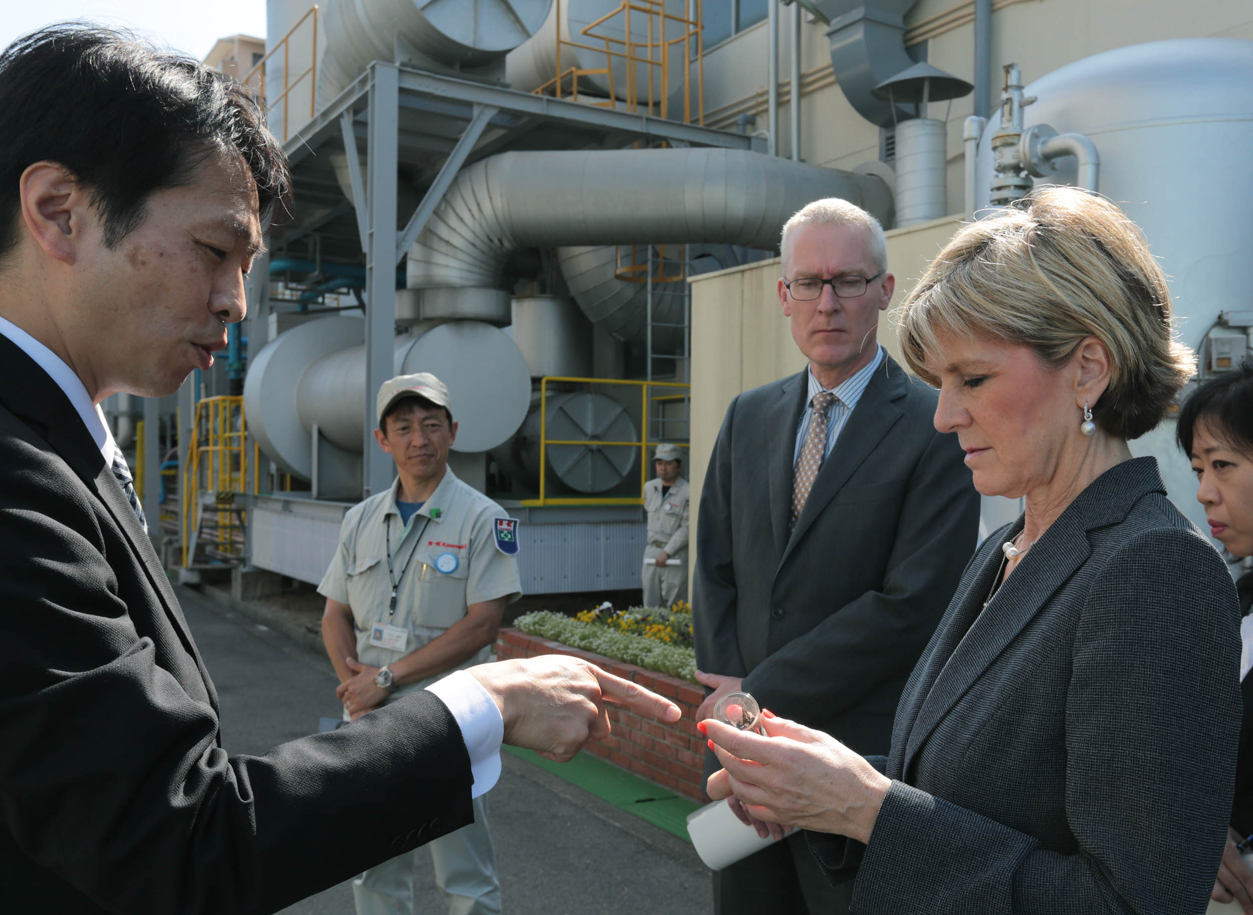 Senior executives from Kawasaki Heavy Industries showing models of new products to the Hon Julie Bishop MP, Minister for Foreign Affairs, and HE Mr Bruce Miller, Australian Ambassador to Japan.