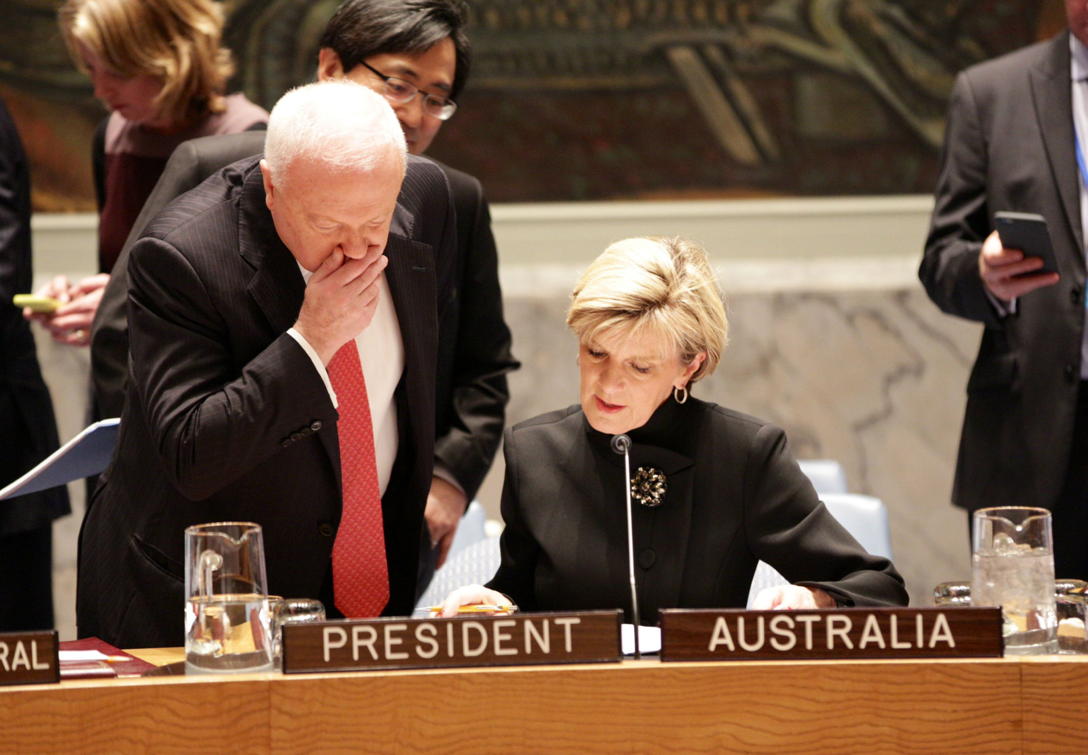 Foreign Minister Julie Bishop consulting with Australian Ambassador to the United Nations before chairing a United Nations Security Council meeting on counter-terrorism in New York, 19 November, 2014. (Credit: DFAT/Trevor Collens)