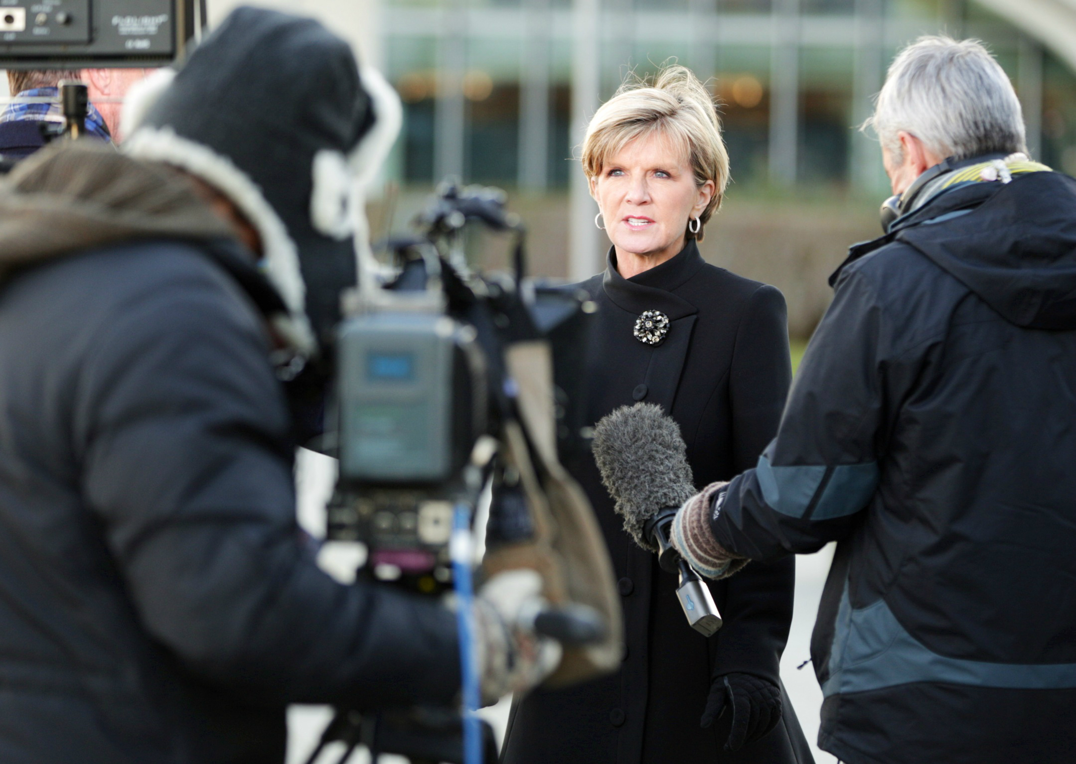 Foreign Minister Julie Bishop speaks to Australian press between meetings in New York, 19 November 2014. (Credit: DFAT/Trevor Collens)