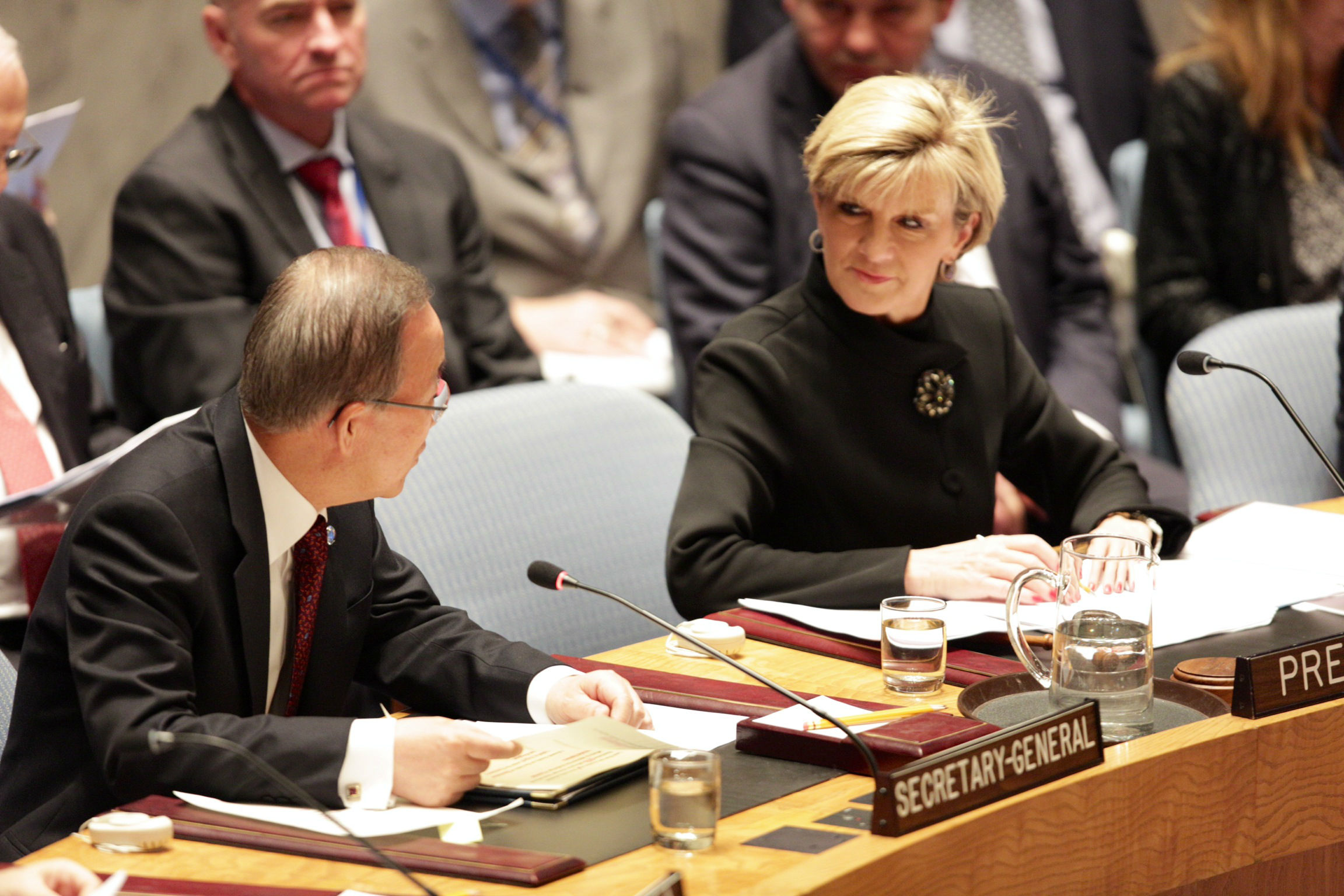 Foreign Minister Julie Bishop with United Nations Secretary-General Ban Ki-moon at a United Nations United Nations Security Council meeting on counter-terrorism in New York, 19 November, 2014. (Credit: DFAT/Trevor Collens)