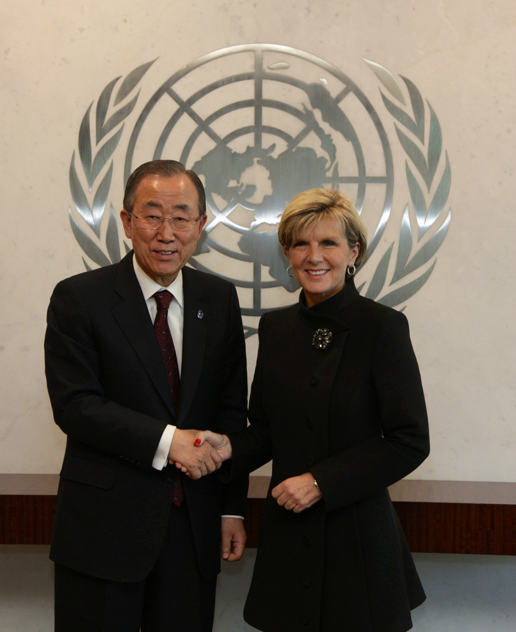 Foreign Minister Julie Bishop meets with United Nations Secretary-General Ban Ki-moon in New York, 19 November 2014. (DFAT/Trevor Collens)