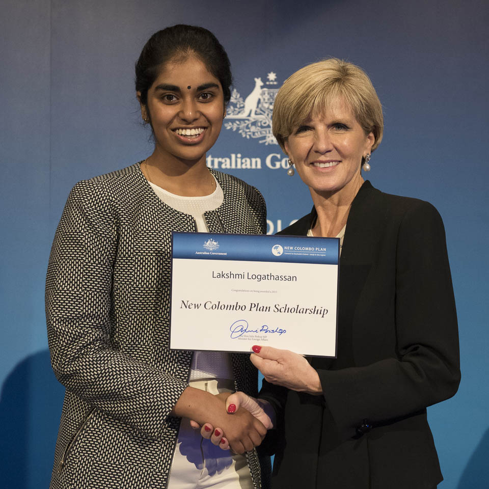Minister Bishop presenting Lakshmi Logathassan UWS studying in Singapore.