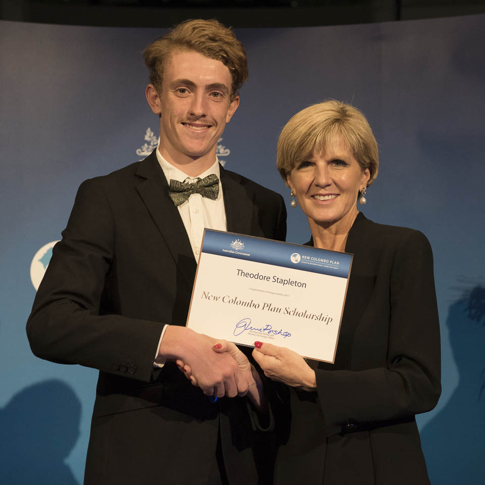Minister Bishop presenting Theodore Stapleton from UWA to study in China.