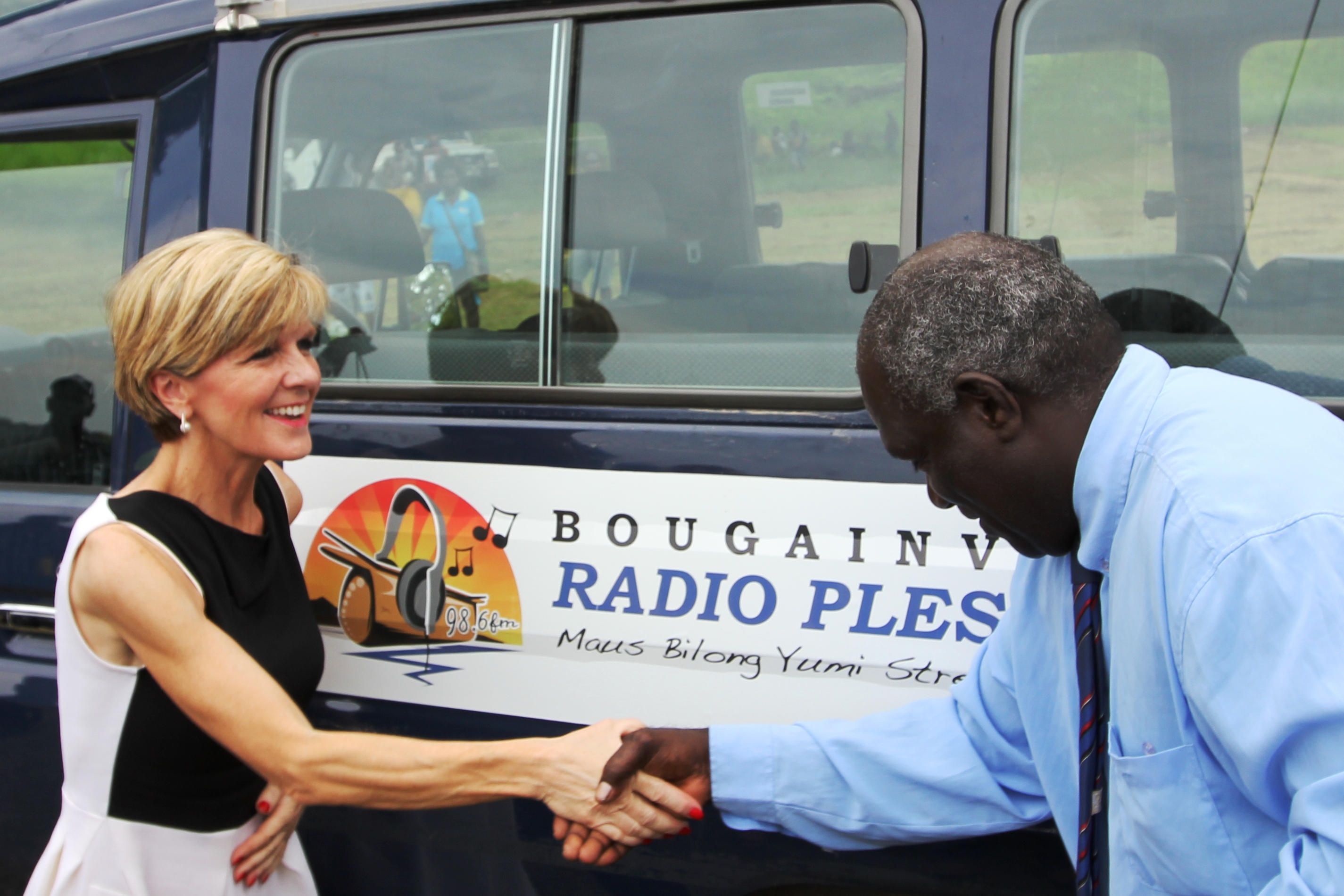 Minister for Foreign Affairs Julie Bishop launches mobile community radio in Arawa with the Hon Melchior Dare, ABG Minister for Commnuity Development. 16 December 2014.