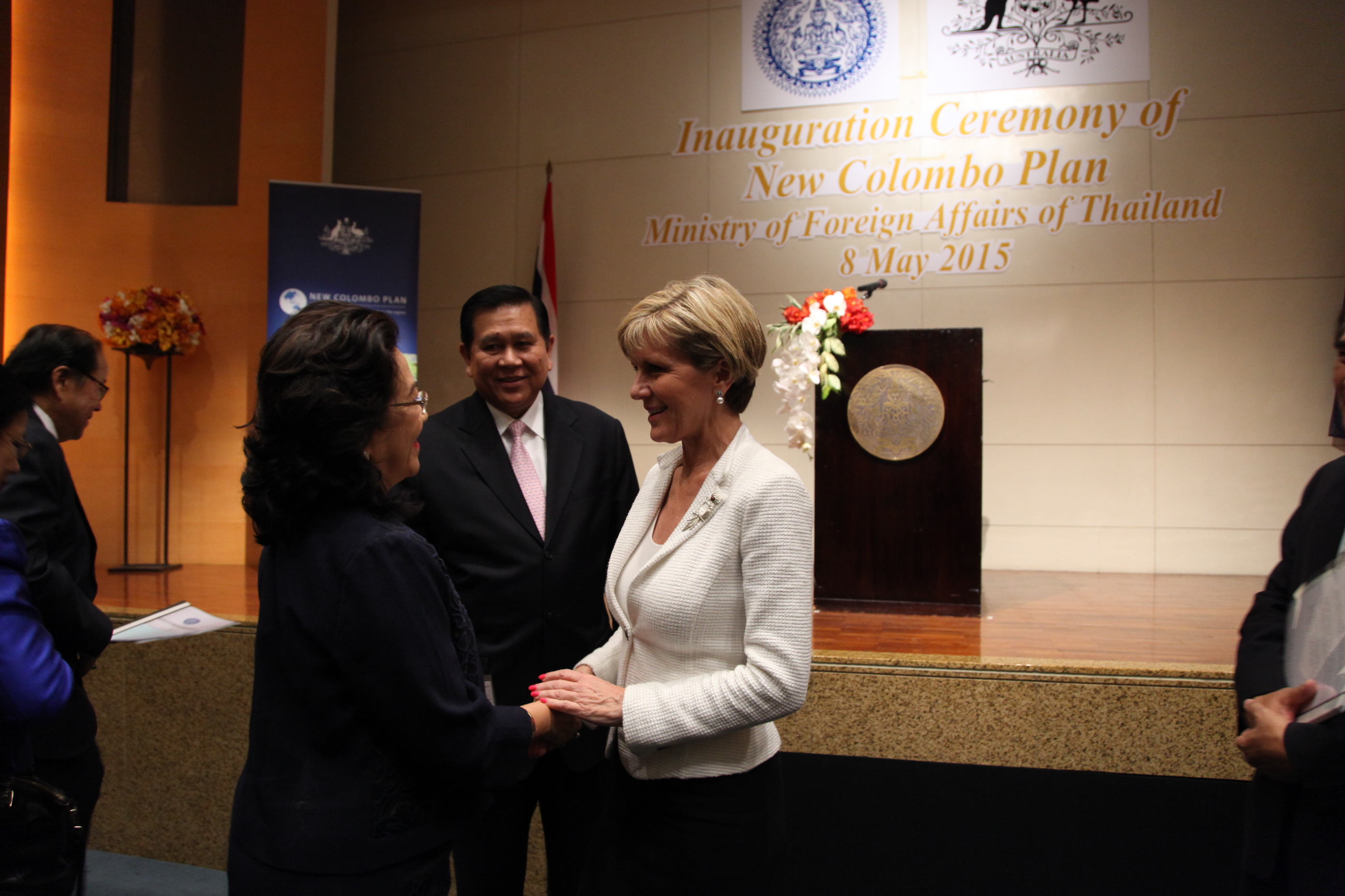 Foreign Minister Julie Bishop with Thai students and former Colombo Plan scholars at the launch of the New Colombo Plan in Thailand. 8 May 2015.
