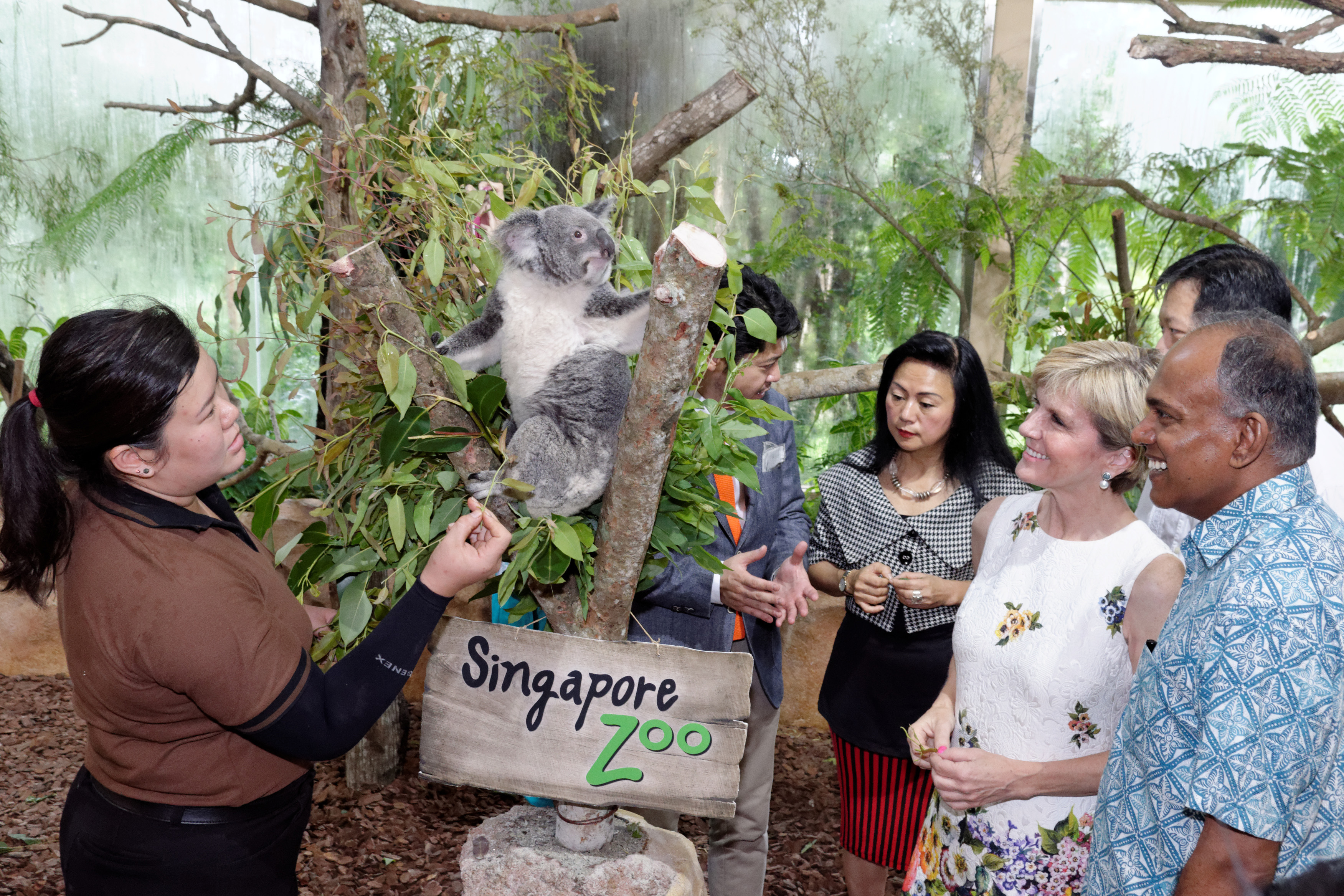 Australia's Foreign Minister Bishop and Singapore's Foreign Minister Shanmugam meet the star attractions at Singapore Zoo's new koala exhibit to mark 50 years of diplomatic relations and 50 years of Singaporean independence. 20 May 2015.