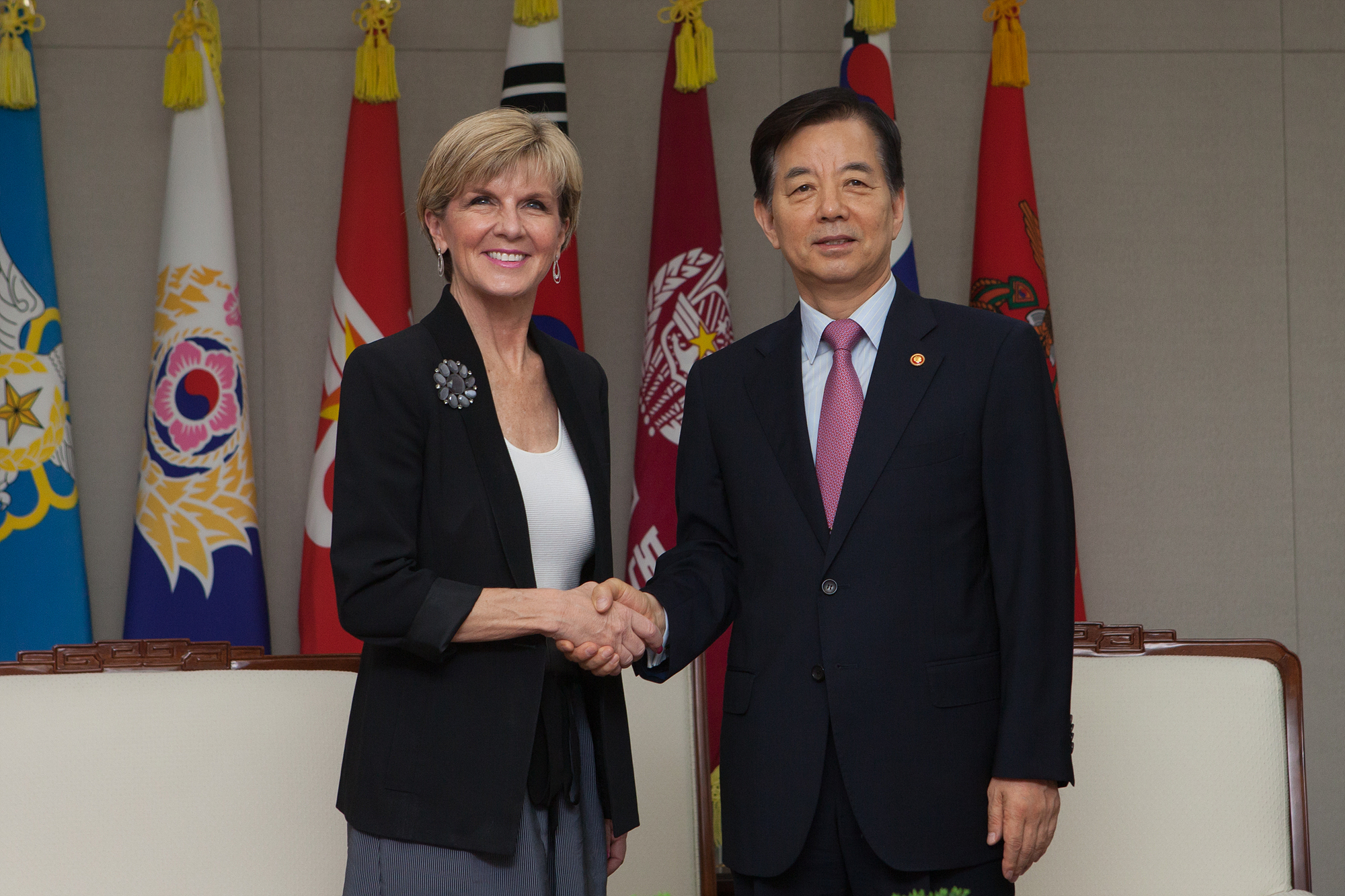 Foreign Minister Bishop exchanging greetings with ROK Minister for National Defense Han Min-koo.
