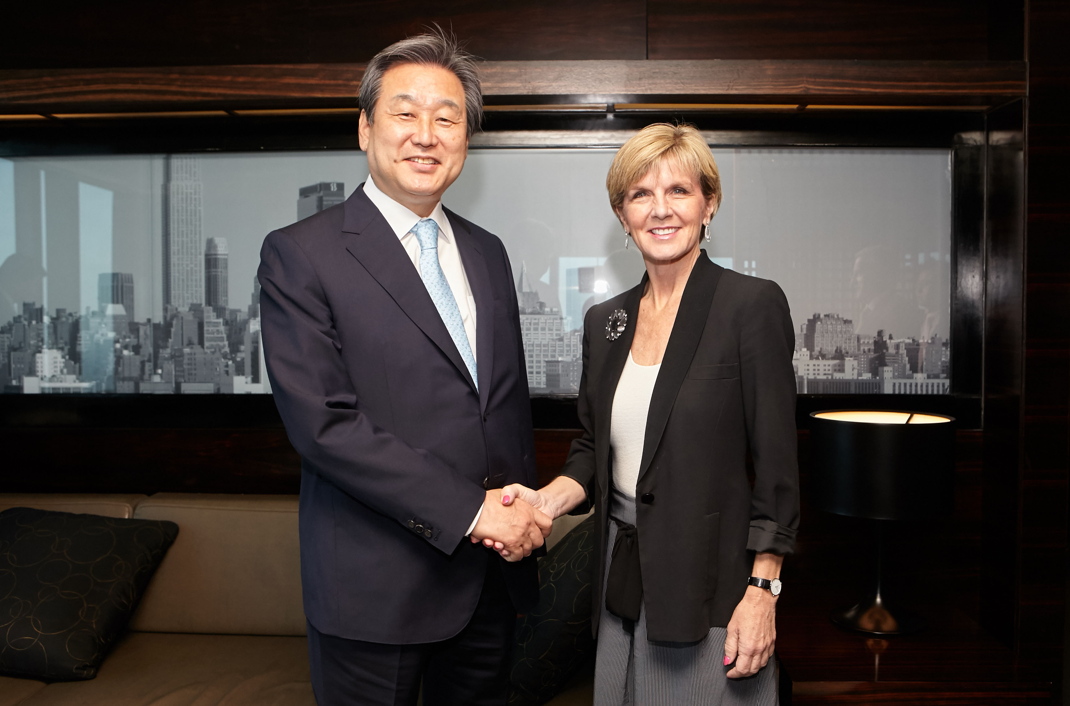 Foreign Minister Bishop greets Kim Moo-sung, Chairman of the Saenuri Party in Korea.