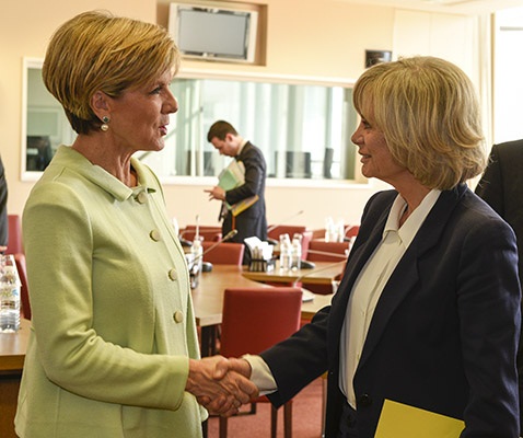 Australia's Foreign Minister Julie Bishop meets with President of the Foreign Affairs Commission Elisabeth Guigou at the National Assembly in Paris. 1 June 2015.