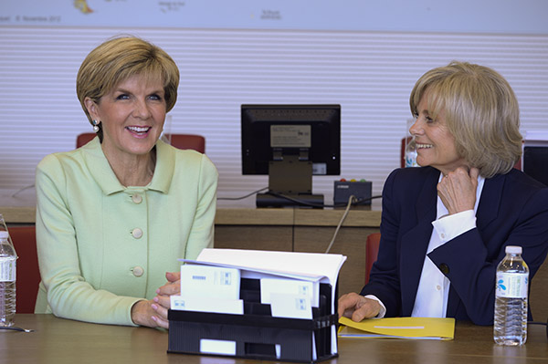 Australia's Foreign Minister Julie Bishop meets with President of the Foreign Affairs Commission Elisabeth Guigou at the National Assembly in Paris. 1 June 2015.