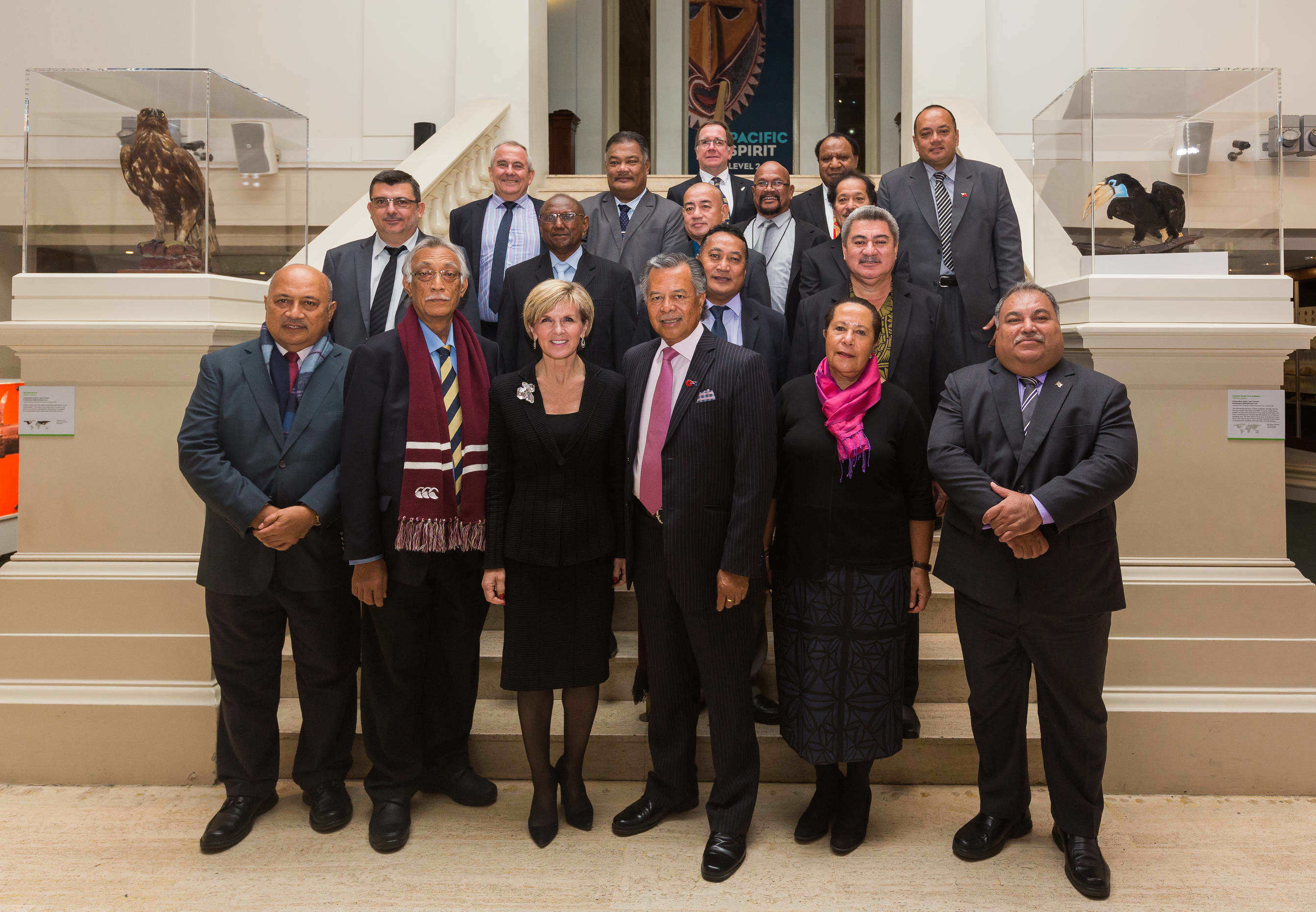 Foreign Minister Bishop with Pacific Islands Leaders and Ministers before the Welcome Dinner of the Pacific Islands Forum Foreign Ministers Meeting at the Australian Museum, Sydney, on 9 July 2015. Also pictured is Dame Meg Taylor, Secretary General, Pacific Islands Forum (front row, second from the Right).