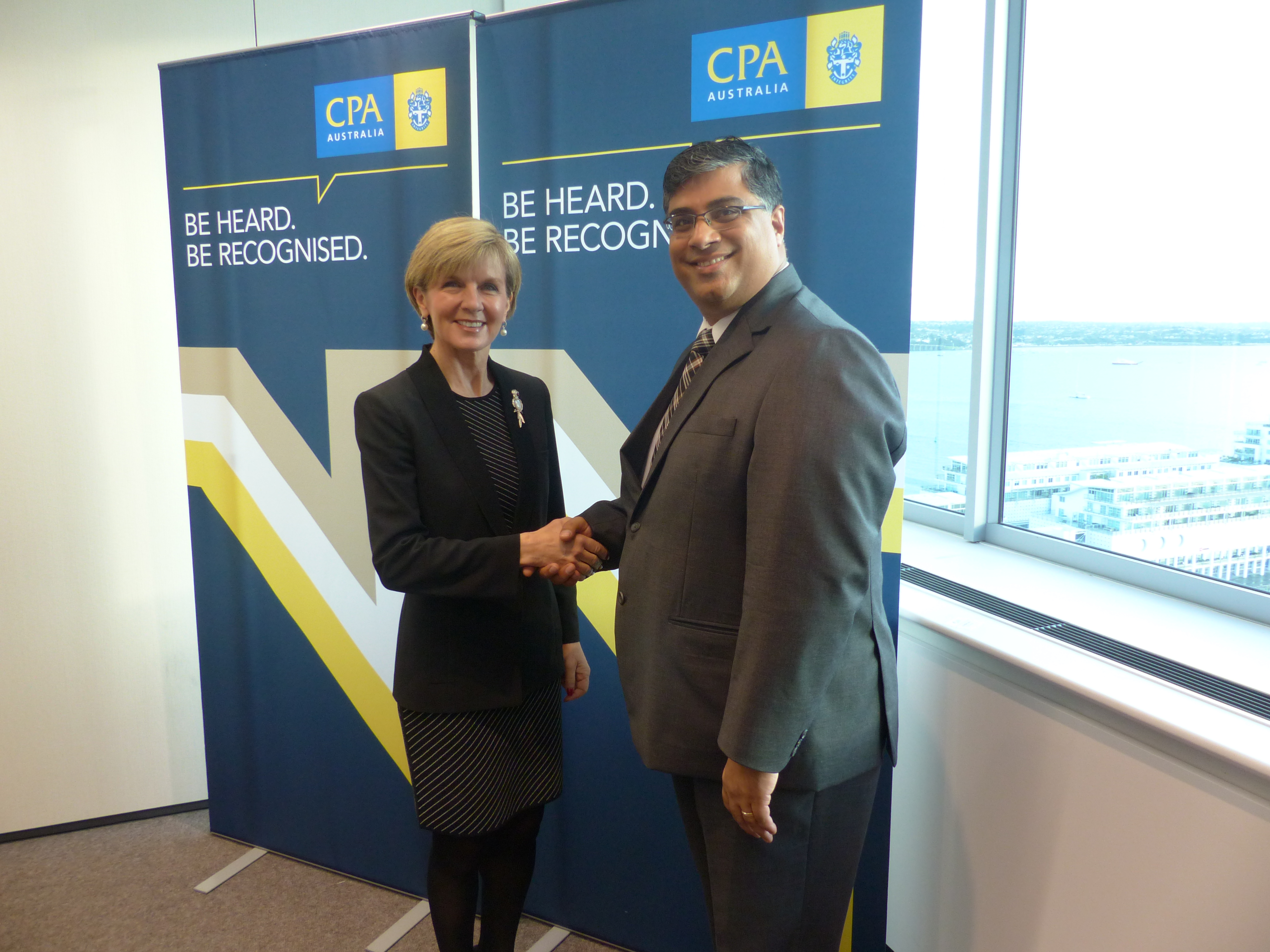 Australia's Foreign Minister Julie Bishop meets Mr Chandan Ohri, President of NZ Council of CPA Australia in Auckland. 1 July 2015.