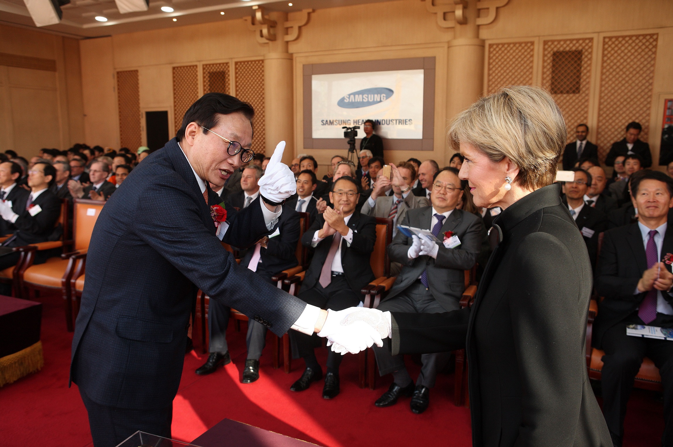 Australia's Foreign Minister Julie Bishop accepts a gift from Prime Minister Hon Enele Sosene Sopoaga of Tuvalu in Auckland. 30 June 2015.