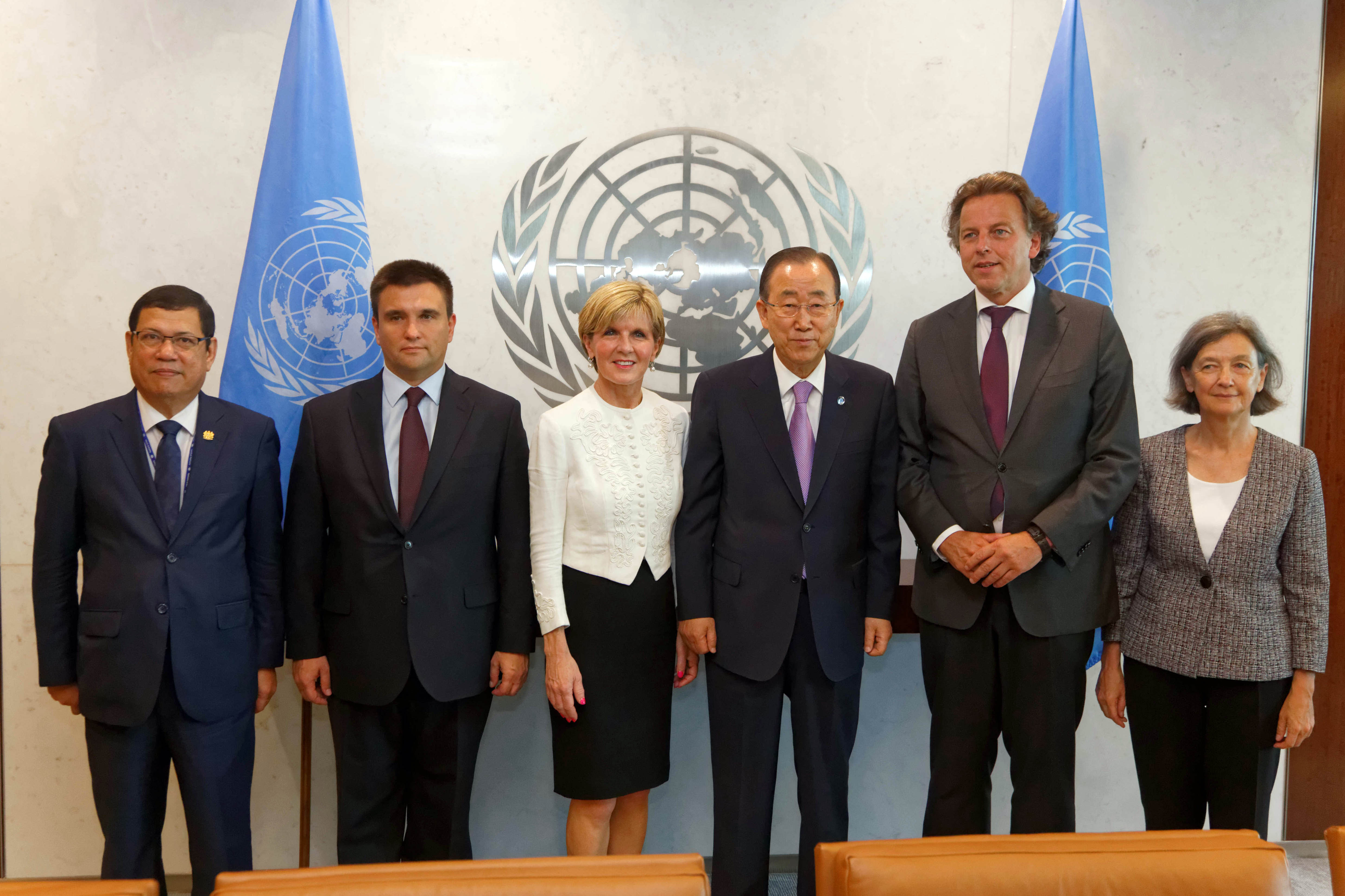 Visit to New York by Minister for Foreign Affairs Julie Bishop, 29 July 2015. Minister Julie Bishop and representatives of Malaysia Belgium, Ukraine, and the Netherlands, members of the Joint Investigative Team (JIT) Minister's Caucus into the downing of Malaysia Airlines flight MH17 meet with UN Secretary General Ban Ki-moon at UN Headquarters. photo by Trevor Collens
