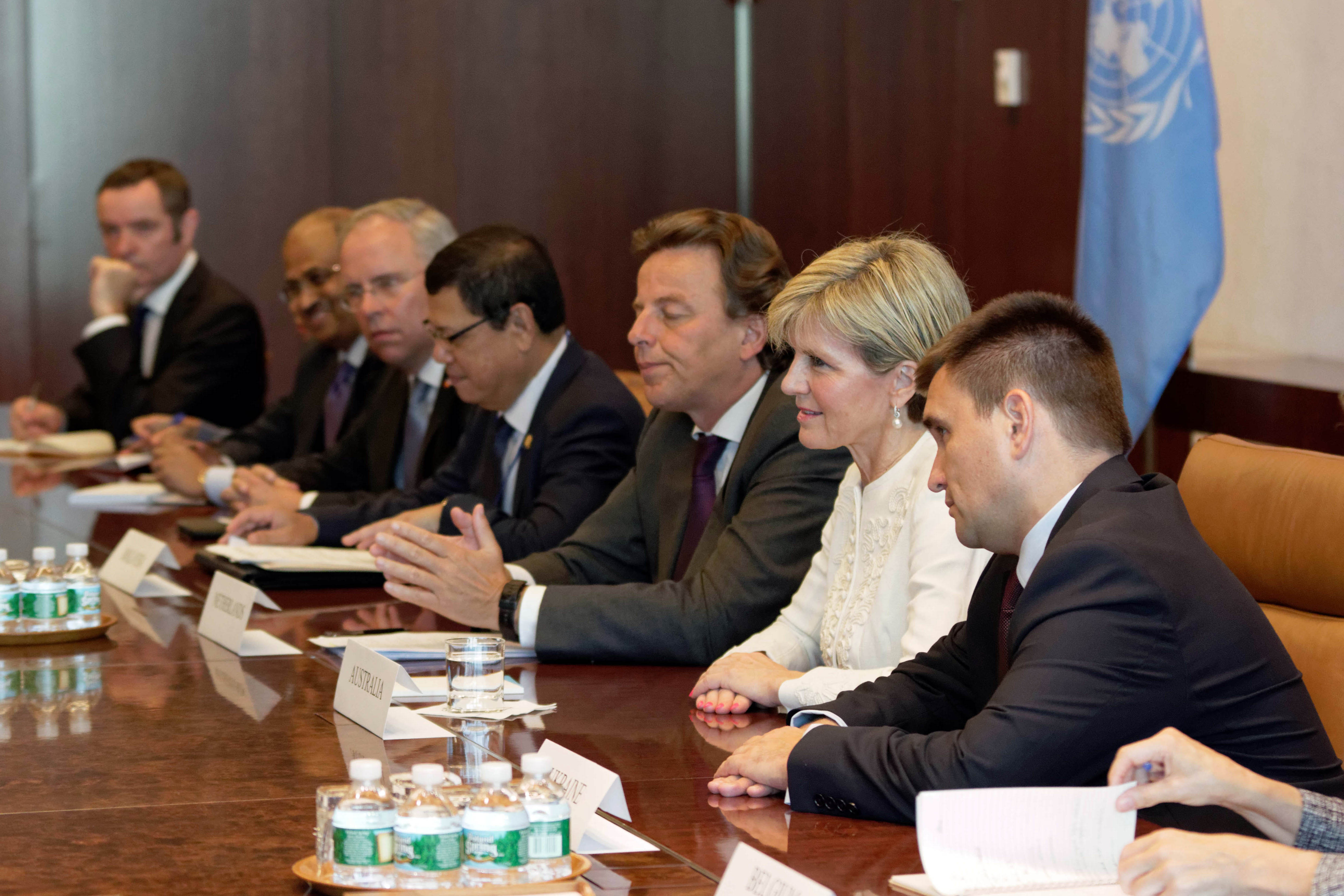 Visit to New York by Minister for Foreign Affairs Julie Bishop, 29 July 2015. Minister Julie Bishop and representatives of Malaysia Belgium, Ukraine, and the Netherlands, members of the Joint Investigative Team (JIT) Minister's Caucus into the downing of Malaysia Airlines flight MH17 meet with UN Secretary General Ban Ki-moon at UN Headquarters. photo by Trevor Collens