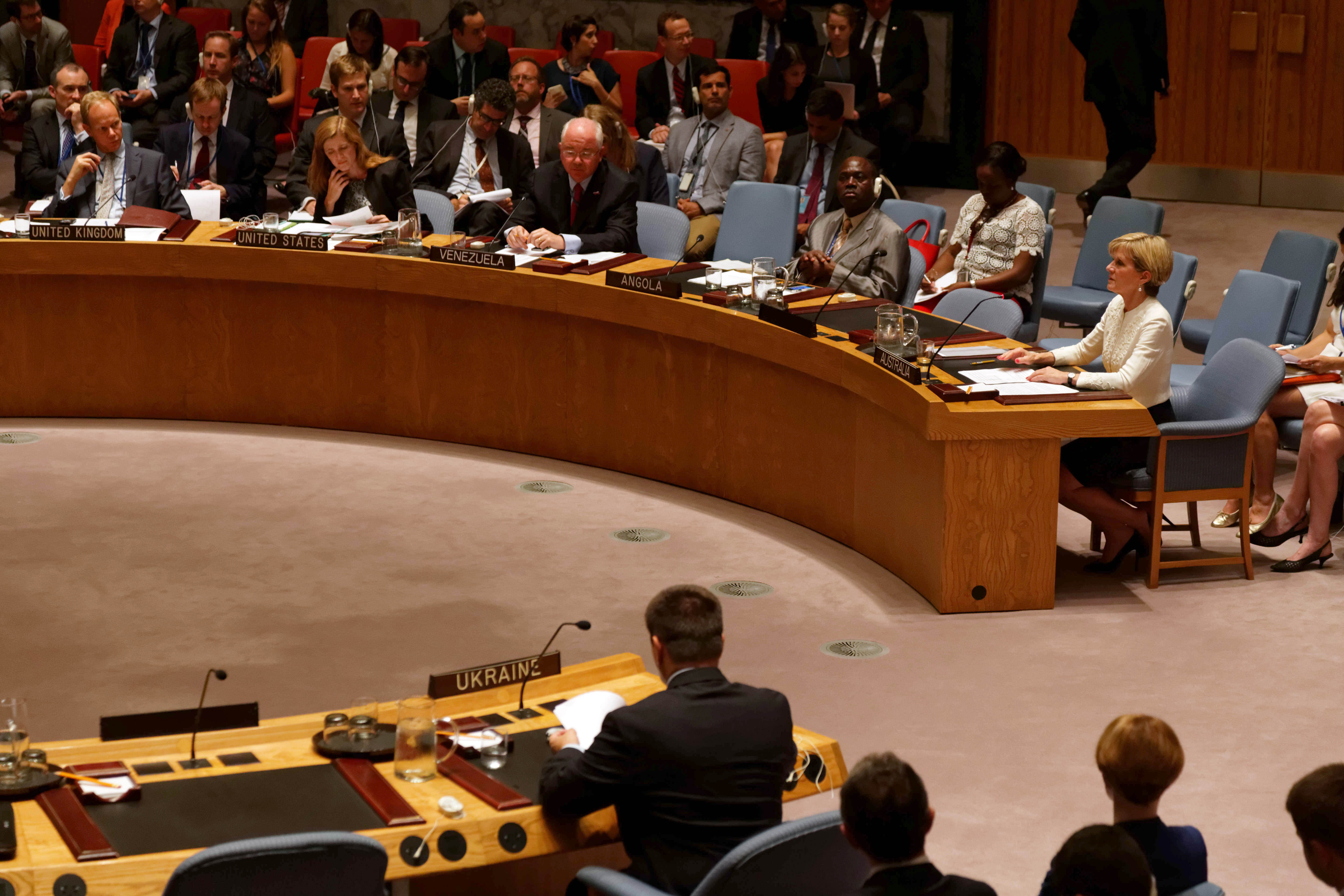 Visit to New York by Minister for Foreign Affairs Julie Bishop, 29 July 2015. Minister Julie Bishop in the UN Security Council where she delivered a statement regarding Malaysia Airline flight MH17 downed over Ukraine. photo by Trevor Collens