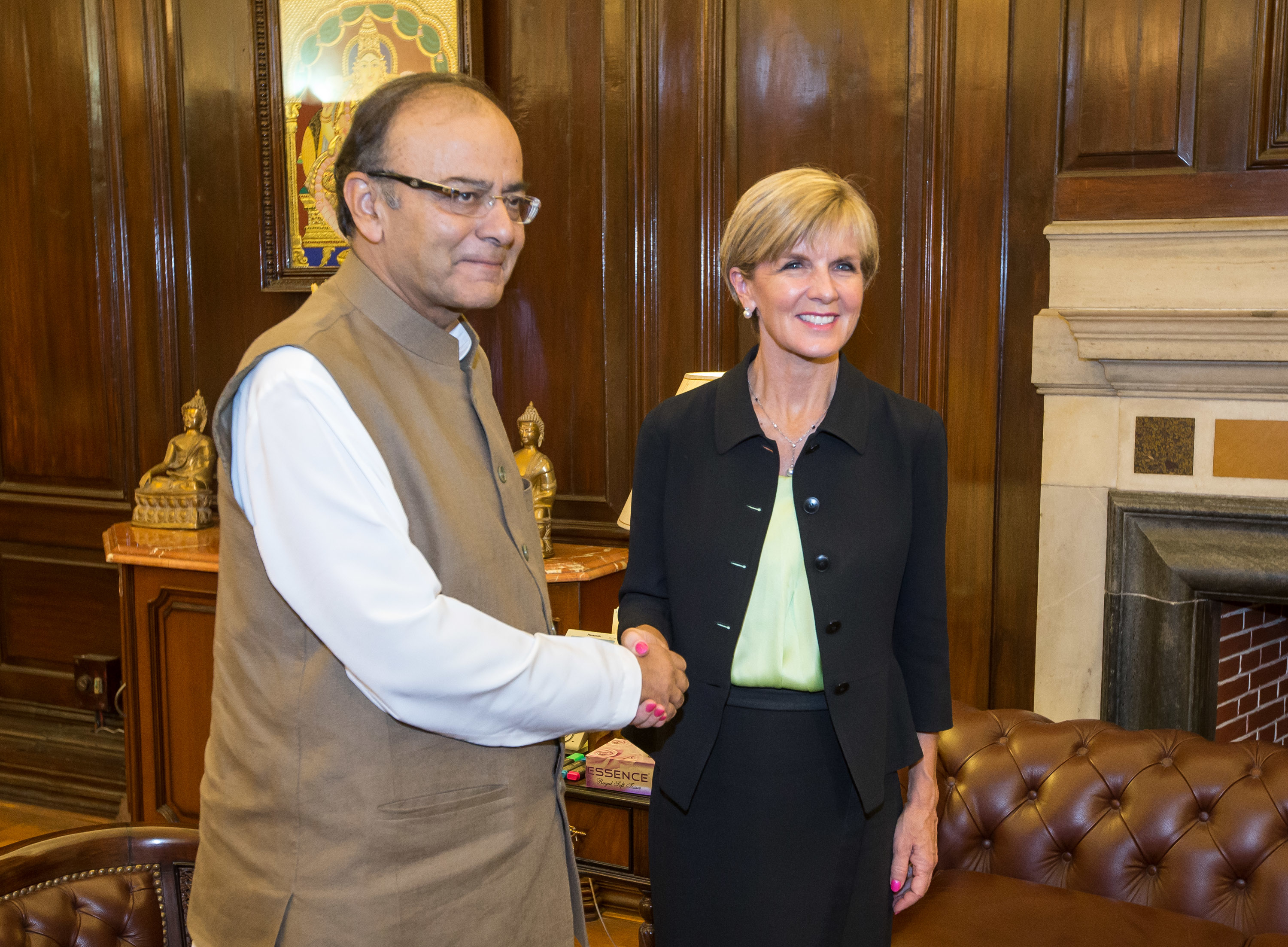 13 April 2015, New Delhi, India; The Hon. Julie Bishop, Australian Minister for Foreign Affairs meeting with Indian Finance Minister Arun Jaitley during her visit to India to promote trade and investment opportunities for Australia. Picture by Graham Crouch/DFAT