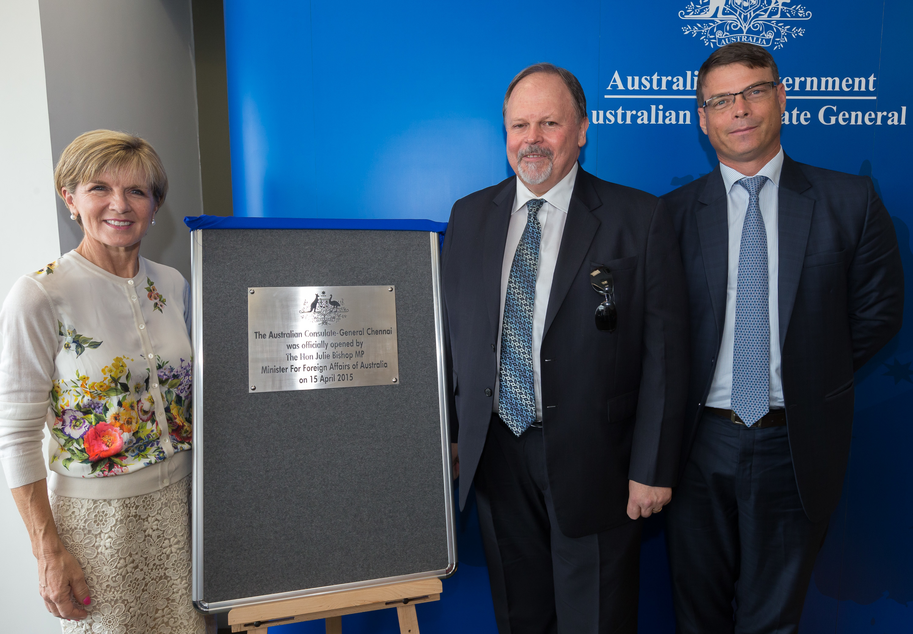 15 April 2015, Chennai, Tamil Nadu, India; The Hon. Julie Bishop, Australian Minister for Foreign Affairs is welcomed with a traditional Indian greeting to participate in the opening of the Australian Consulate, Chennai, during her visit to India to promote trade and investment opportunities for Australia. Picture by Graham Crouch/DFAT