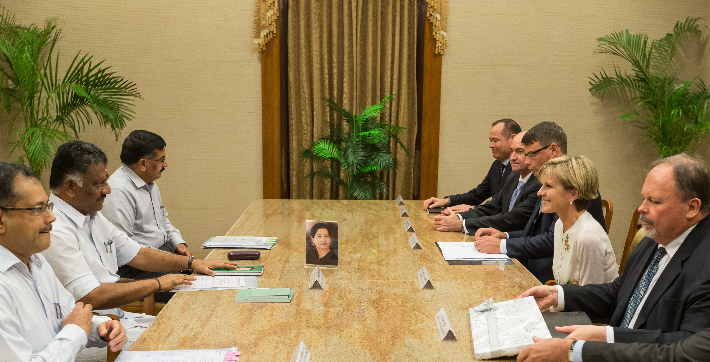 15 April 2015, Chennai, Tamil Nadu, India; The Hon. Julie Bishop, Australian Minister for Foreign Affairs meeting with Chief Minister of Tamil Nadu, O. Panneerselvam during her visit to India to promote trade and investment opportunities for Australia. Picture by Graham Crouch/DFAT
