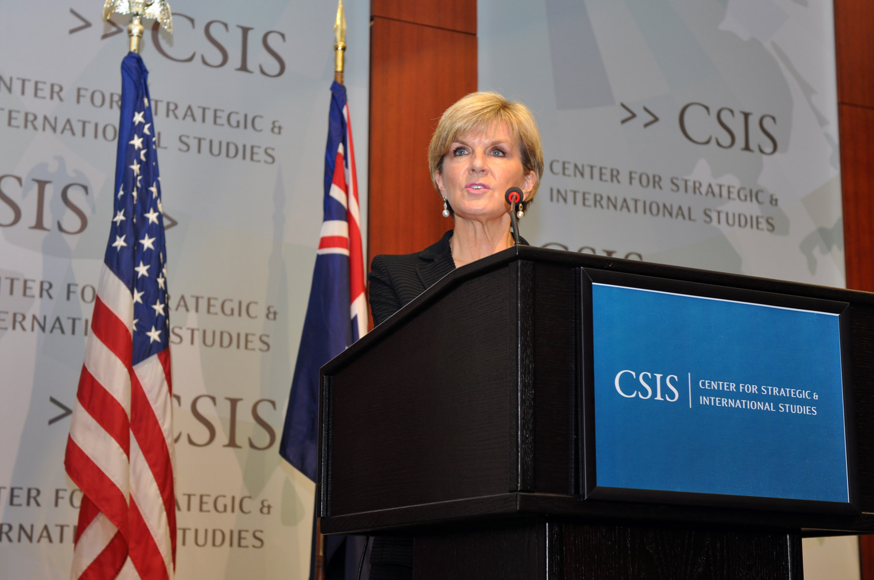 Foreign Minister Julie Bishop presenting her speech on "Challenges to Global Democratic Governance" at the Center for Strategic and International Studies in Washington DC on 14 October 2015.
