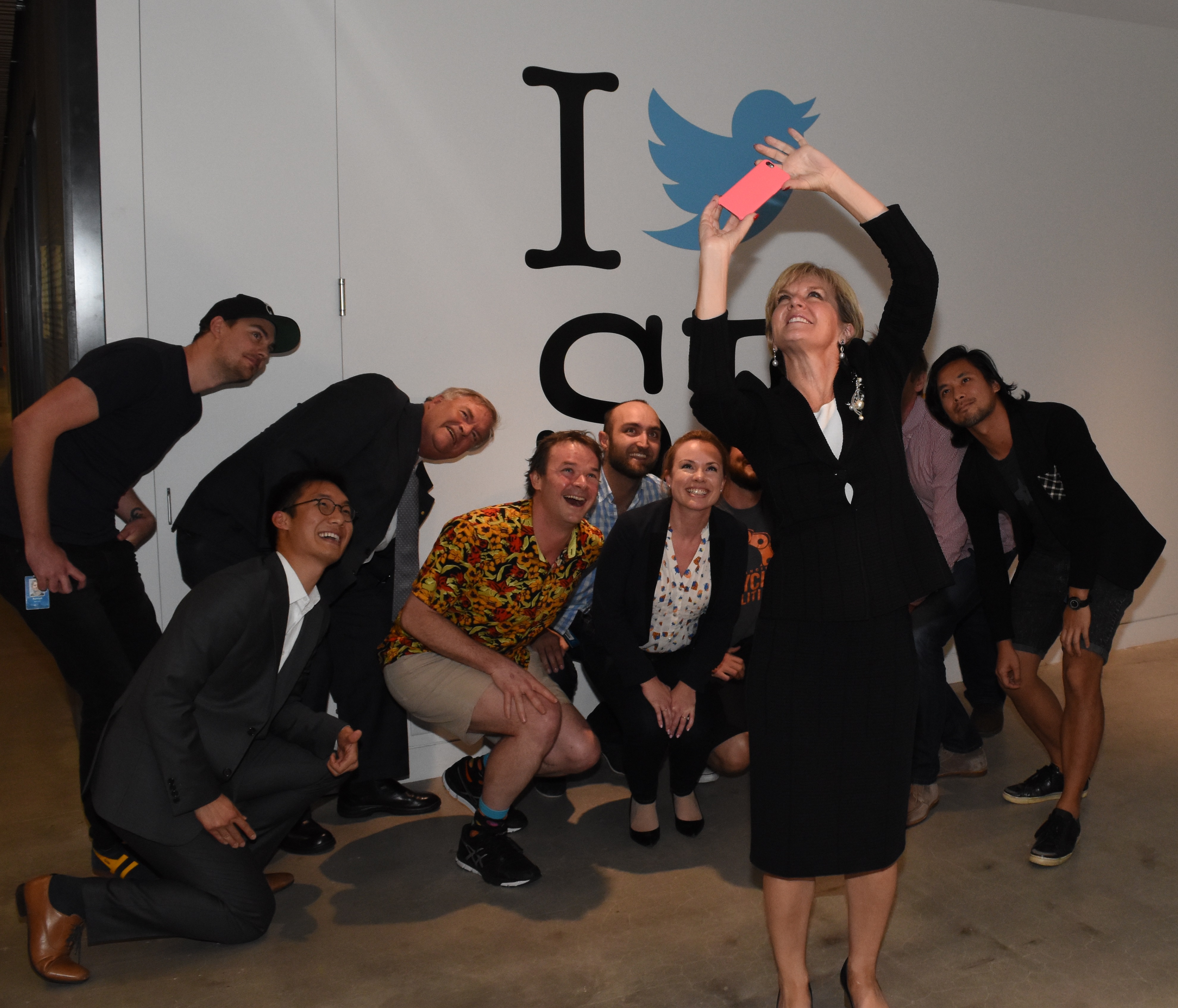 Foreign Minister Julie Bishop snaps a selfie with Australia’s Ambassador to the USA, Kim Beazley and Twitter staff at Twitter Headquarters in San Francisco on 9 October 2015.