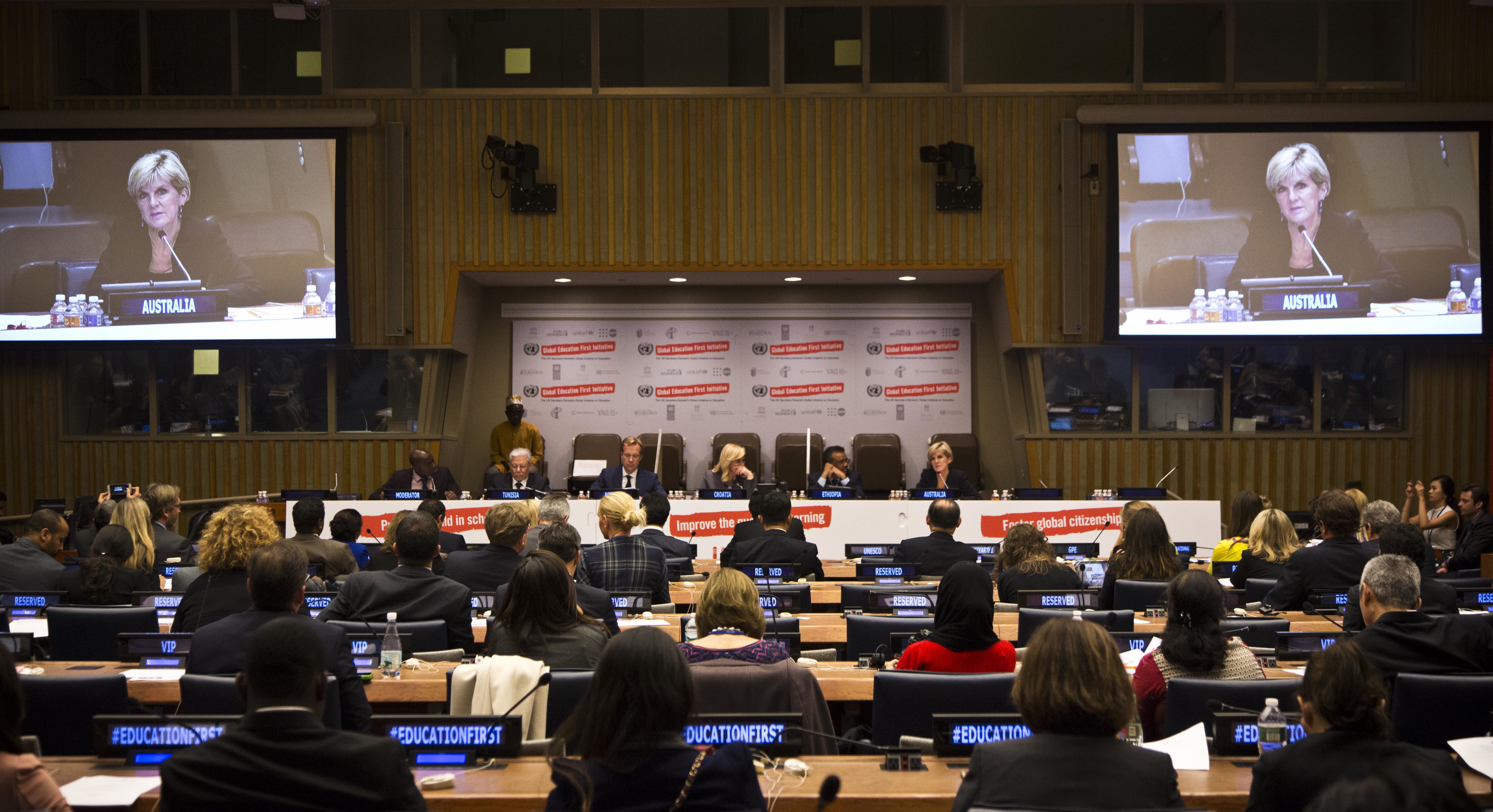 Australian Foreign Minister Julie Bishop speaks at a Global Education First Initiative meeting at UN Headquarters in New York, Saturday September 26, 2015. photo by Trevor Collens/DFAT
