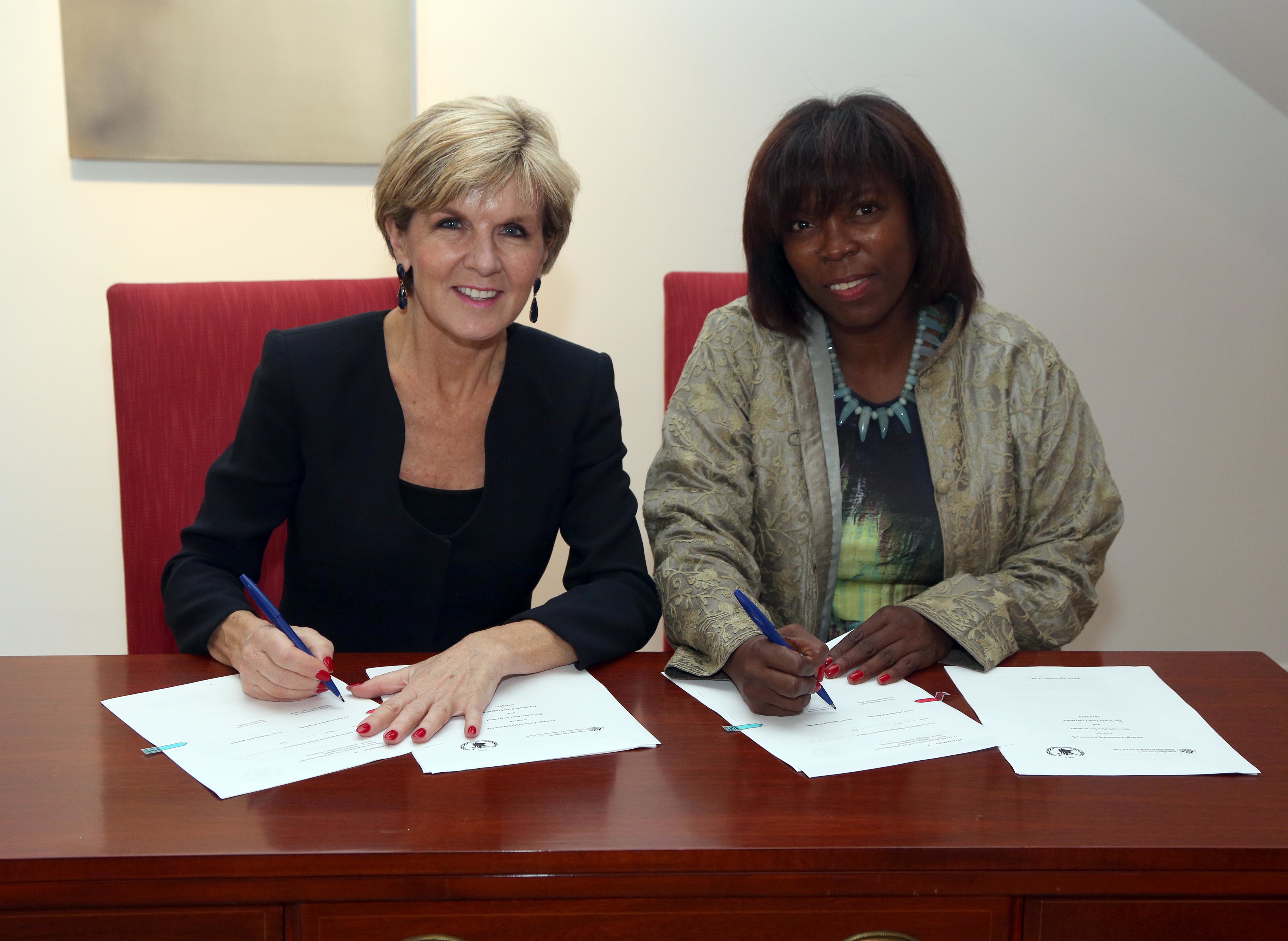 Australian Foreign Minister Julie Bishop signs partnership agreement with Ms Ertharin Cousins, executive director of the UN World Food Programme at the Ambassadors residence in New York, Saturday September 26, 2015. photo by Trevor Collens/DFAT