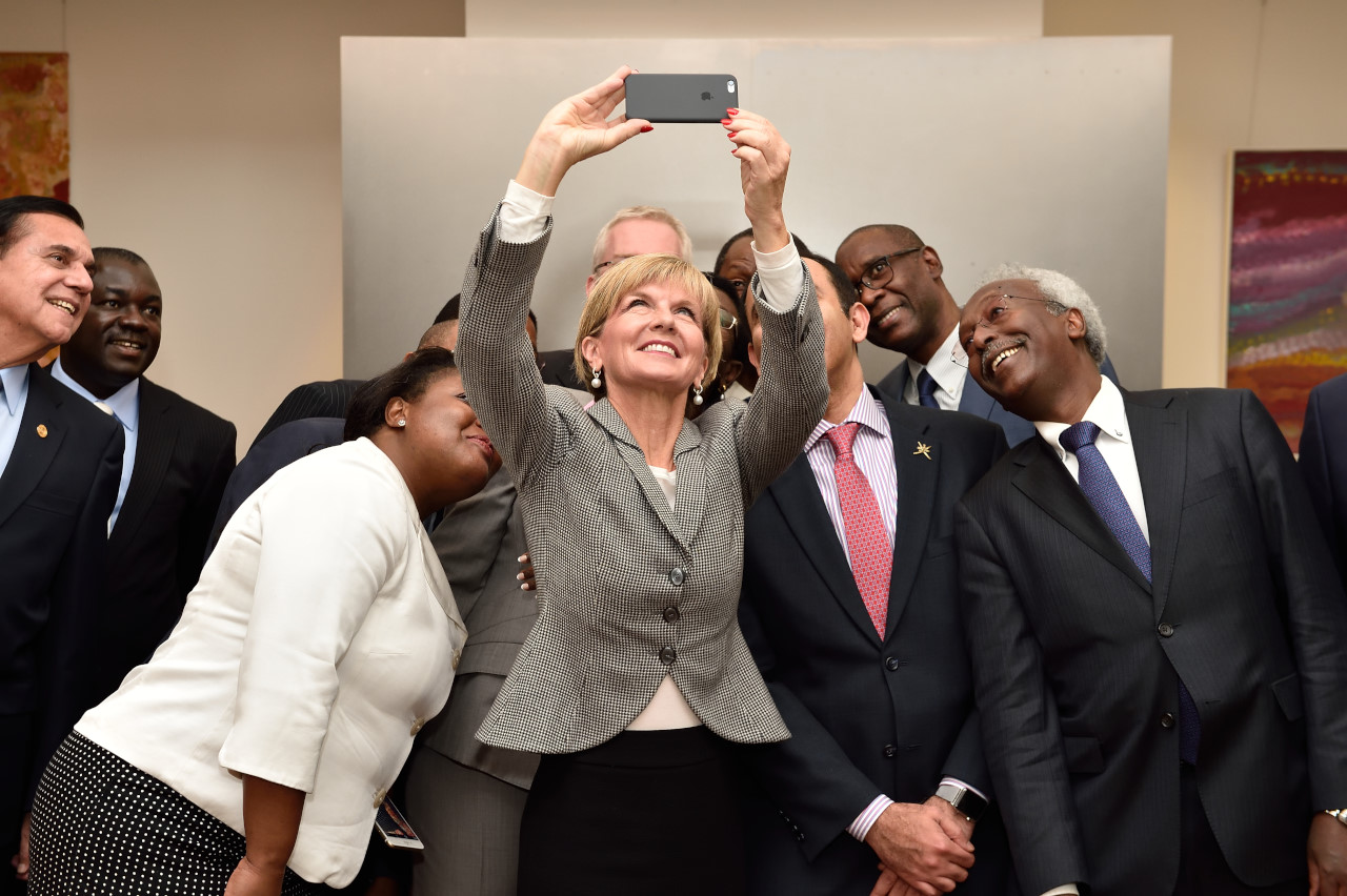 Foreign Minister Julie Bishop takes a selfie with Non-resident Accredited Ambassadors at Ambassador Miller’s residence.