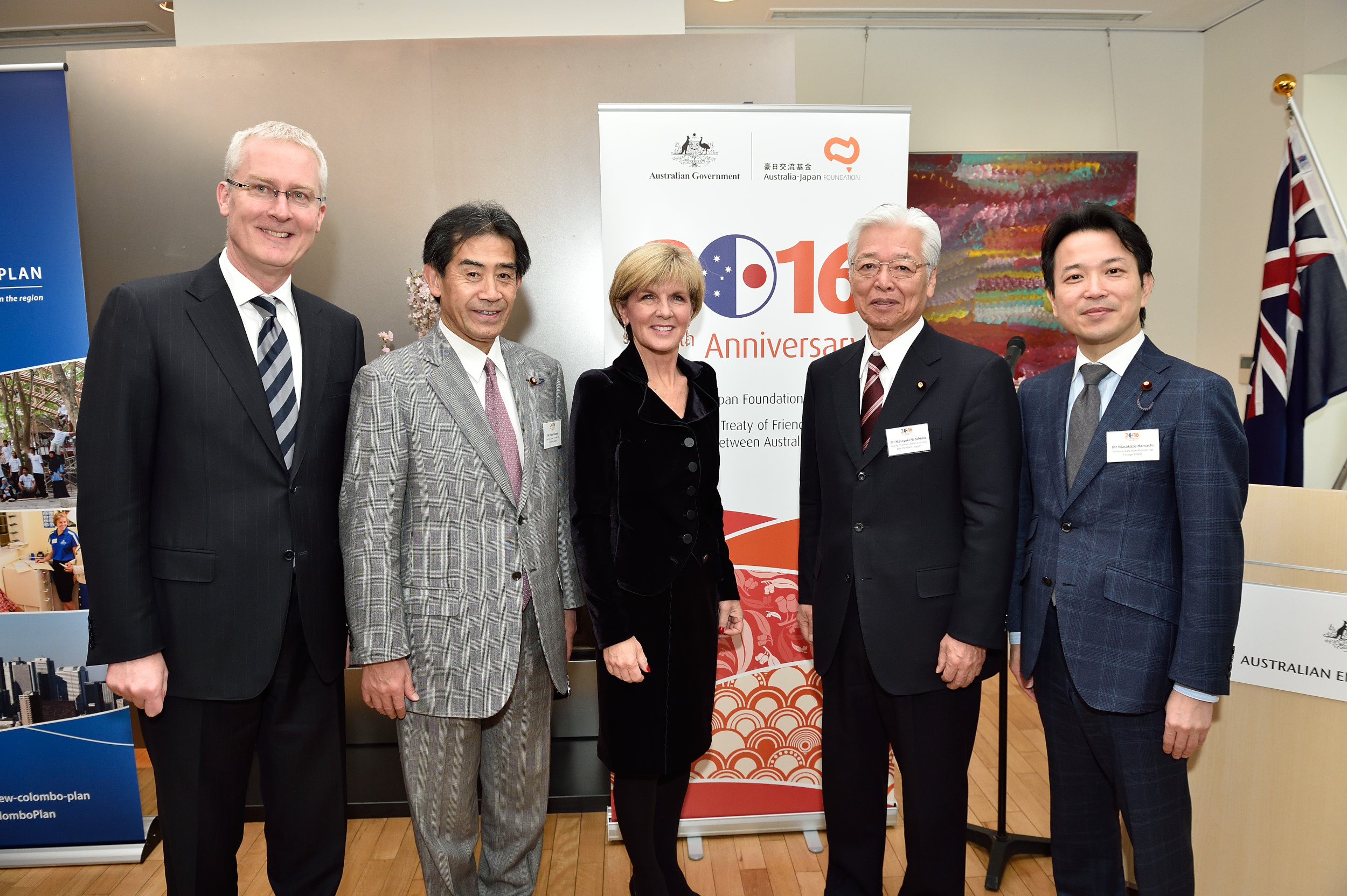 Foreign Minister Julie Bishop with Ambassador Bruce Miller, Japan-Australia Diet Members League Chair, Mr Ichiro Aisawa, Japan-Australia Diet Members League Deputy Chairman, Mr Masayuki Naoshima, and Parliamentary Vice-Minister for Foreign Affairs, Mr Masakazu Hamachi, at the event commemorating the fortieth anniversary of the Basic Treaty of Friendship and Cooperation between Australia and Japan on 16 February 2016.