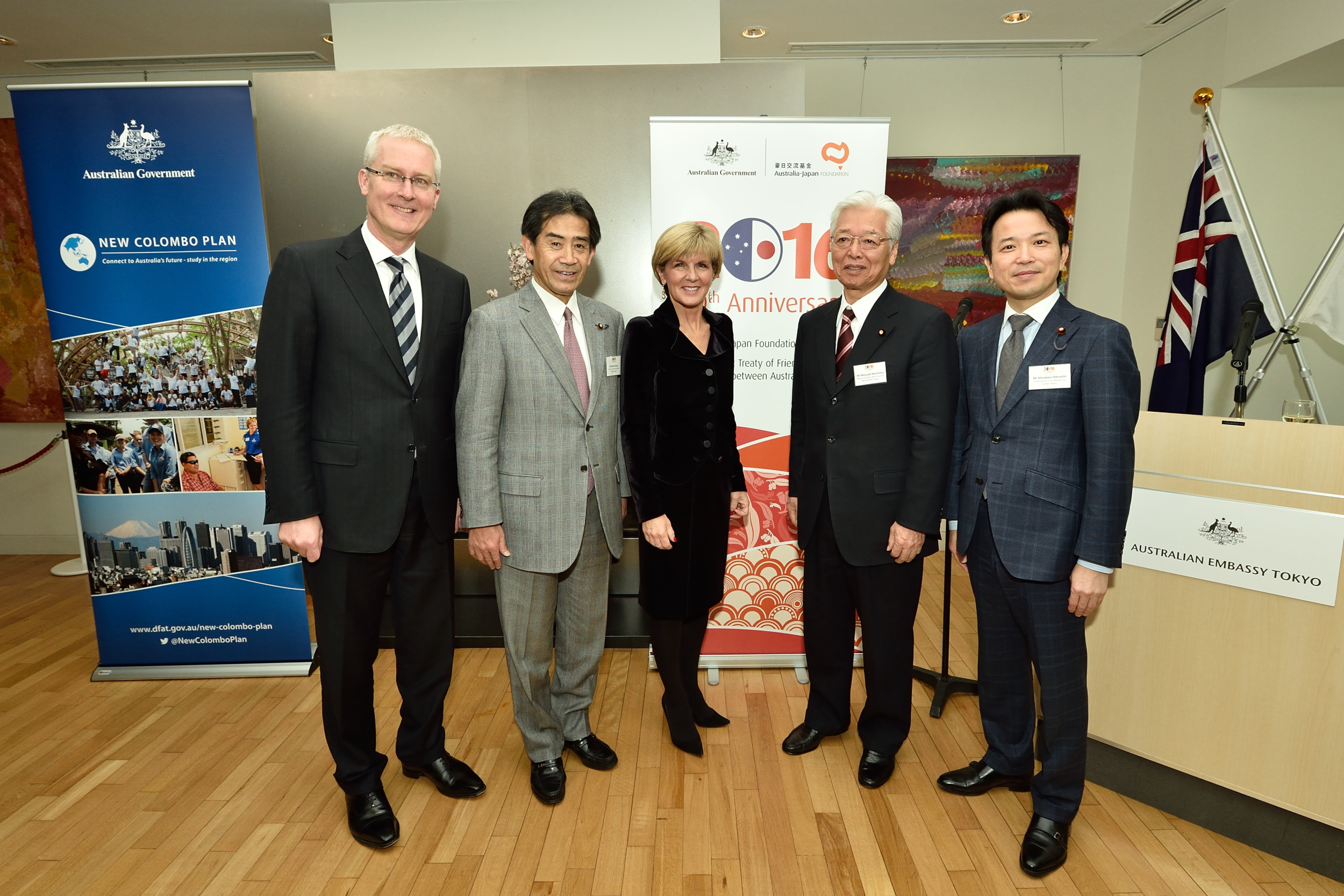 Foreign Minister Julie Bishop with Ambassador Bruce Miller, Japan-Australia Diet Members League Chair, Mr Ichiro Aisawa, Japan-Australia Diet Members League Deputy Chairman, Mr Masayuki Naoshima, and Parliamentary Vice-Minister for Foreign Affairs, Mr Masakazu Hamachi, at the event commemorating the fortieth anniversary of the Basic Treaty of Friendship and Cooperation between Australia and Japan on 16 February 2016.