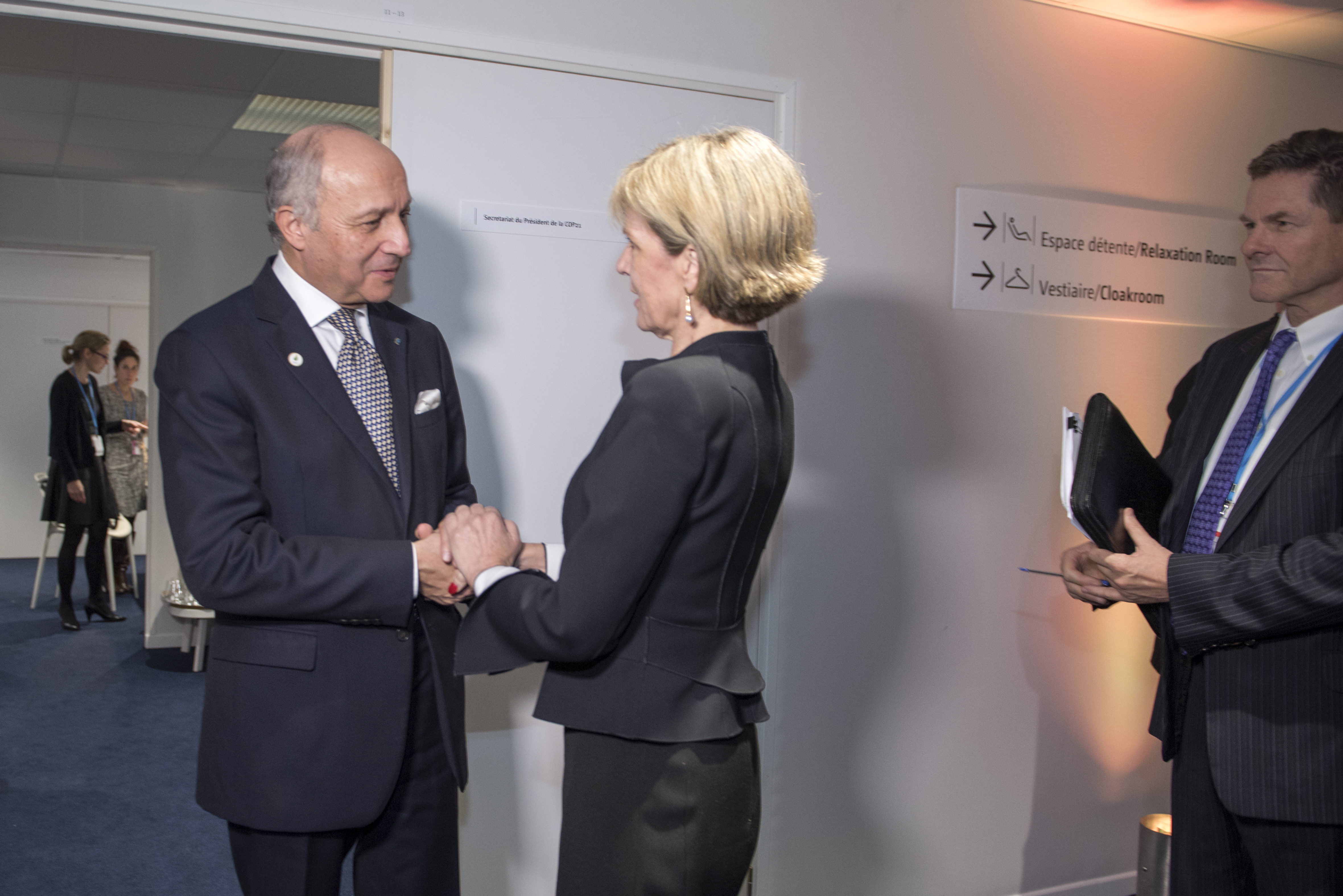 Minister Bishop and French Foreign Minister Laurent Fabius at the COP21 on Wednesday 9 December, 2015