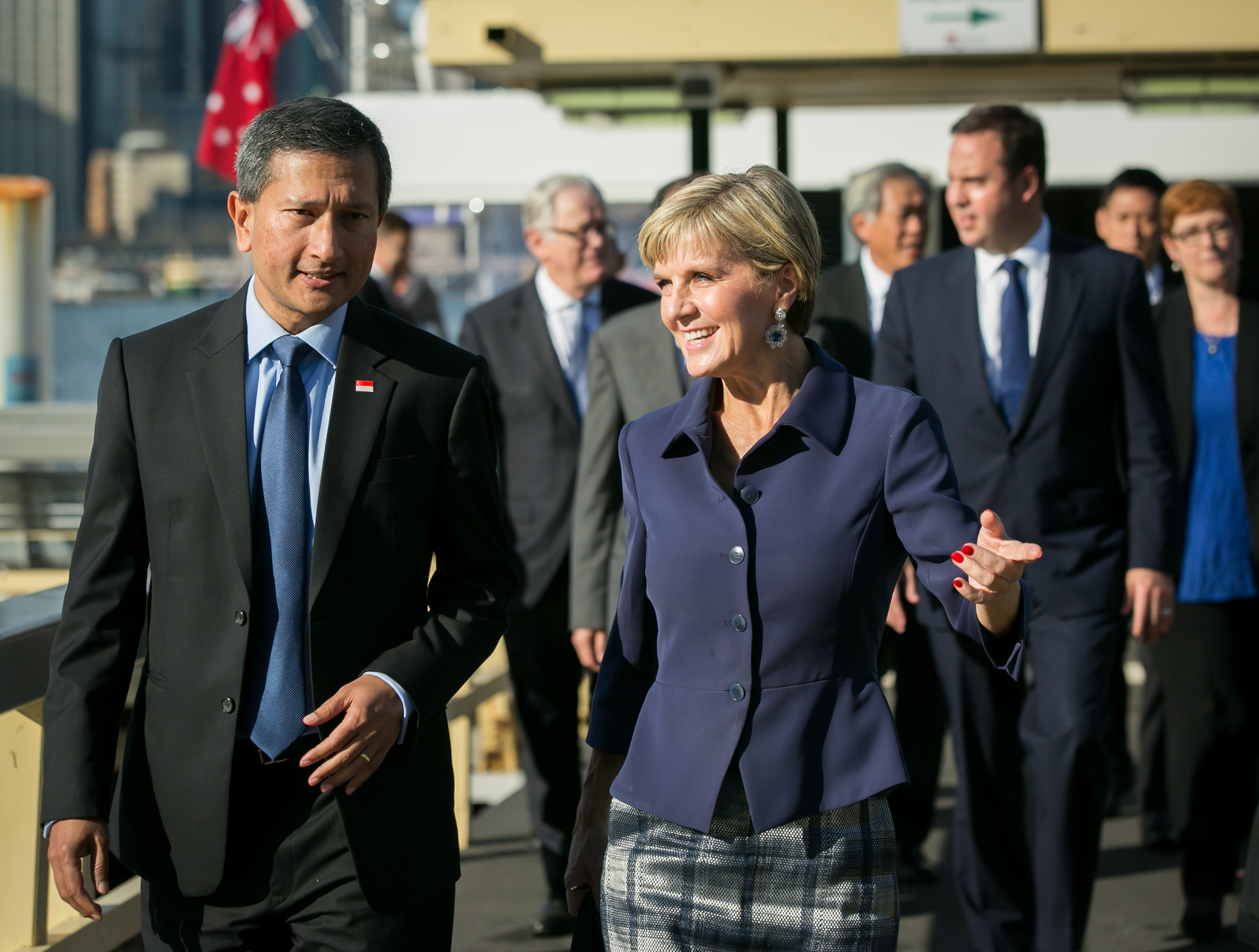 Foreign Minister Julie Bishop and Singapore’s Foreign Minister Vivian Balakrishnan lead their delegations at Jeffrey Street Wharf, 18 March 2016.