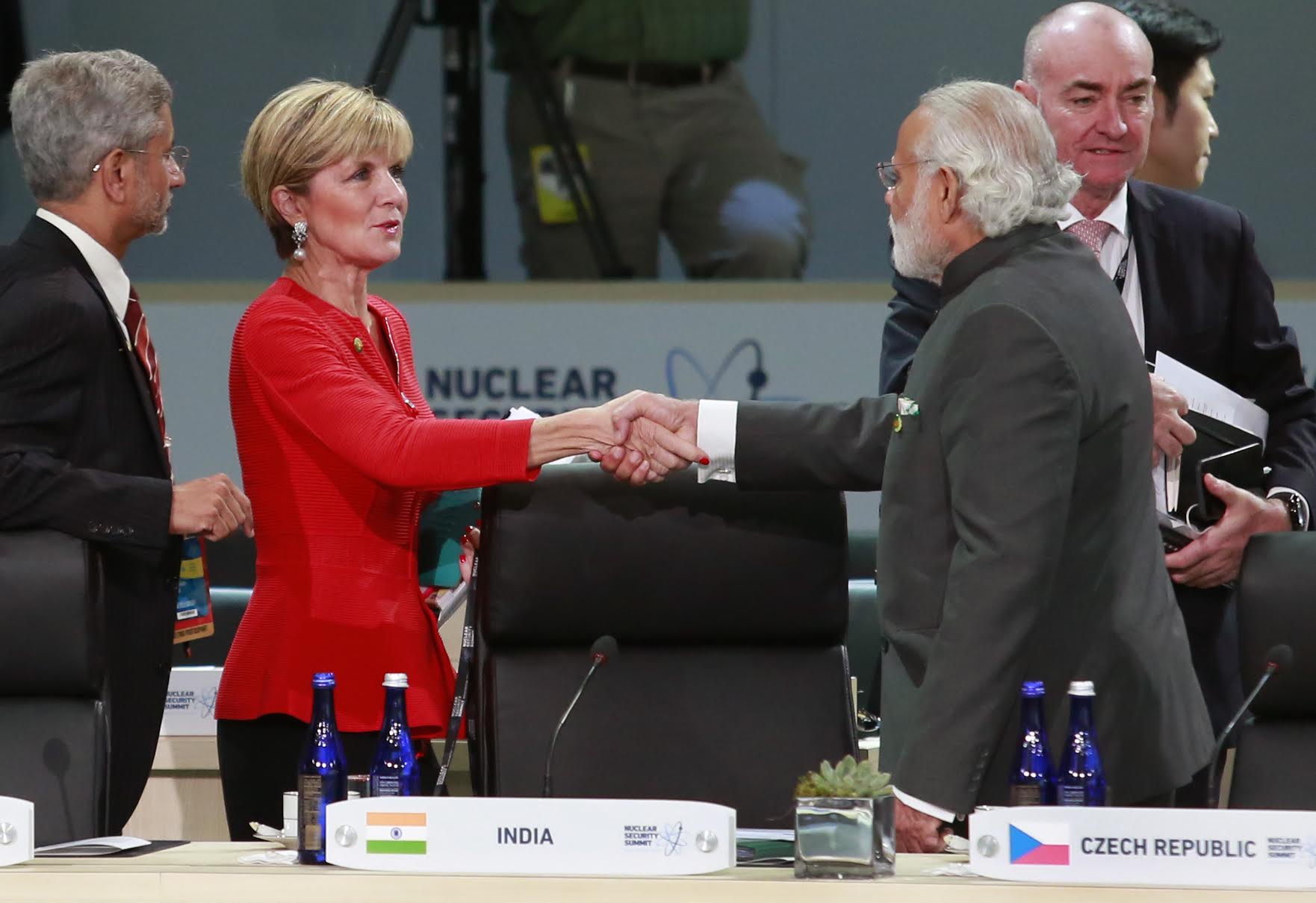 Foreign Minister Julie Bishop catches up with Indian Prime Minister Narendra Modi at the Nuclear Security Summit in Washington DC on 1 April 2016. Photo: Yuri Gripas