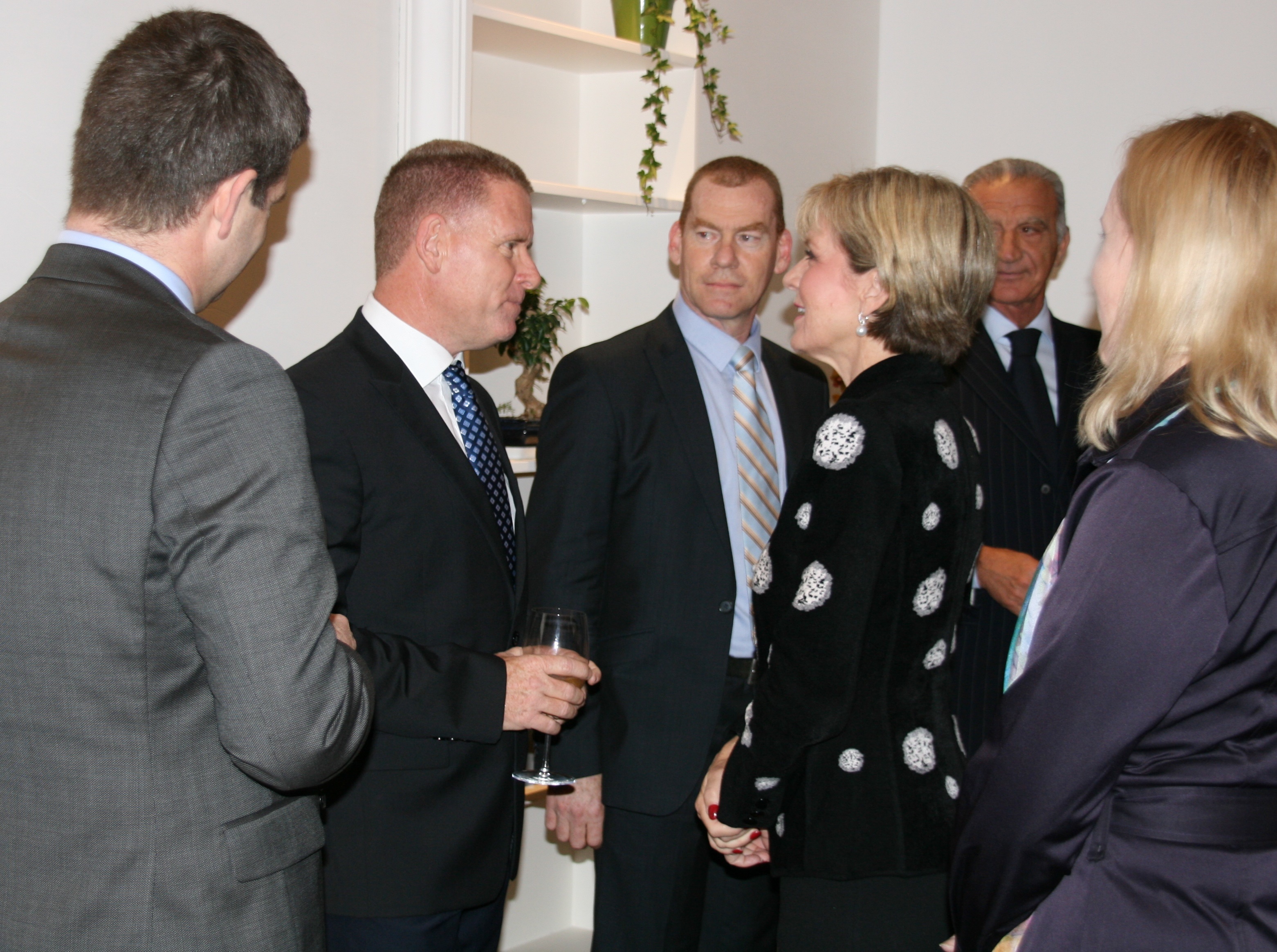 Minister for Foreign Affairs, the Hon. Julie Bishop MP, meets Shayne Bannan, General Manager, Orica GreenEdge at a Business reception at the Australian Ambassador’s Residence in Rome, 2 February 2016. Also pictured: Steven Tingay, Director, Italian Radioastronomy Observatory, and Vincenzo Petrone, Chairman Fincantieri