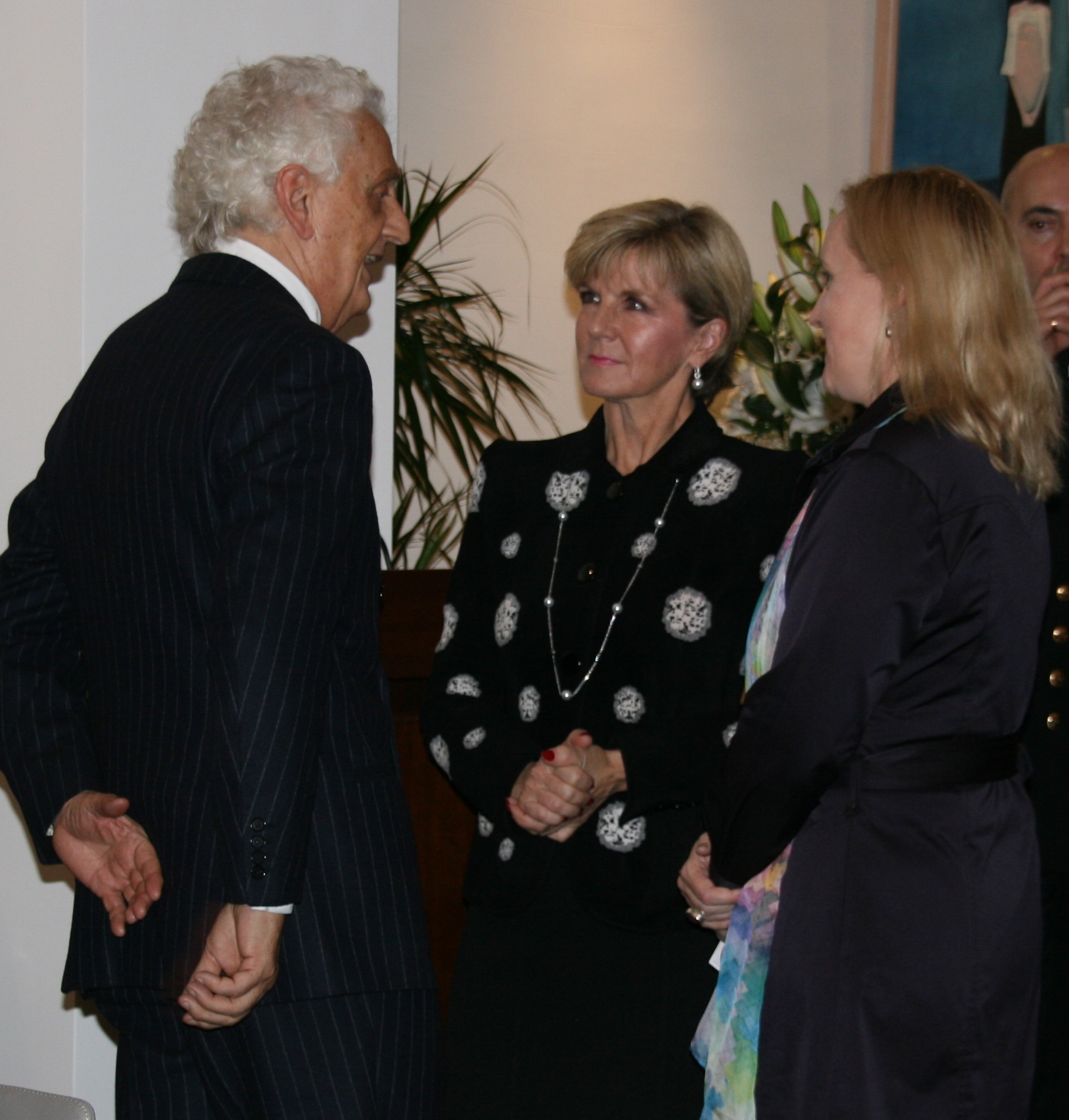 Minister for Foreign Affairs, the Hon. Julie Bishop MP, meets Fabrizio Servente, Global Advisor, AWI (Woolmark), with Jo Tarnawsky, Chargé d’Affaires, Australian Embassy Rome, at a Business reception at the Australian Ambassador’s Residence in Rome, 2 February 2016.