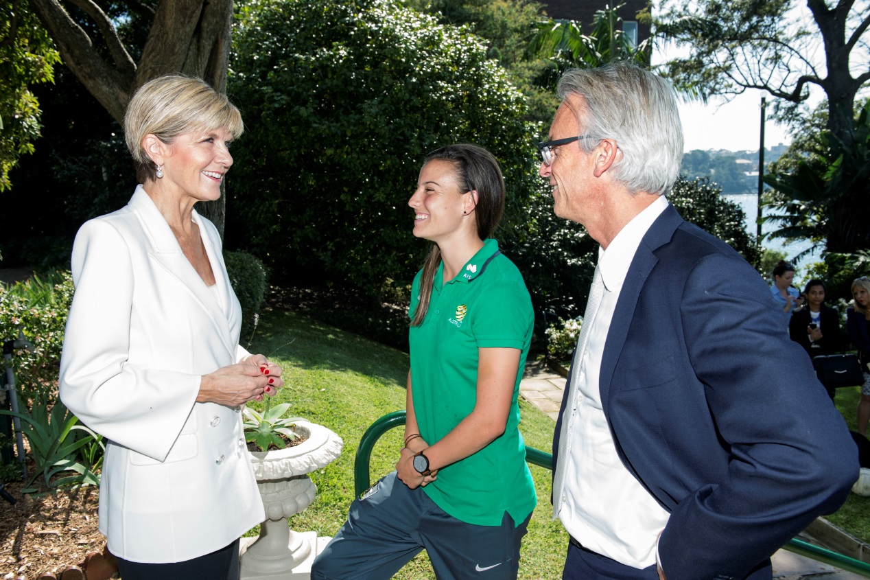 Foreign Minister Julie Bishop, Football Federation CEO David Gallop and Matilda player Chloe Logarzo at the launch of the Asia Sports Partnership Program