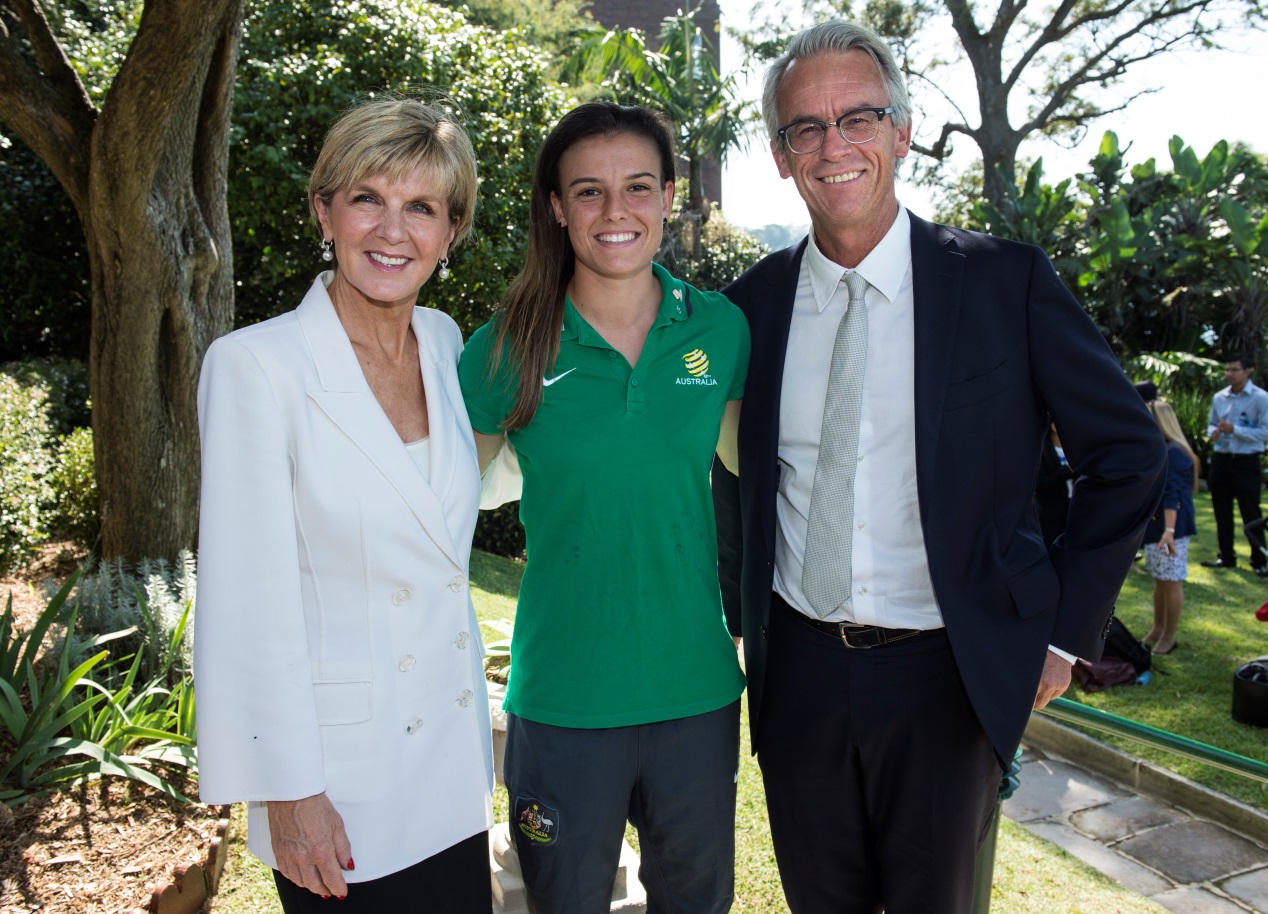 Foreign Minister Julie Bishop, Football Federation CEO David Gallop and Matilda player Chloe Logarzo at the launch of the Asia Sports Partnership Program