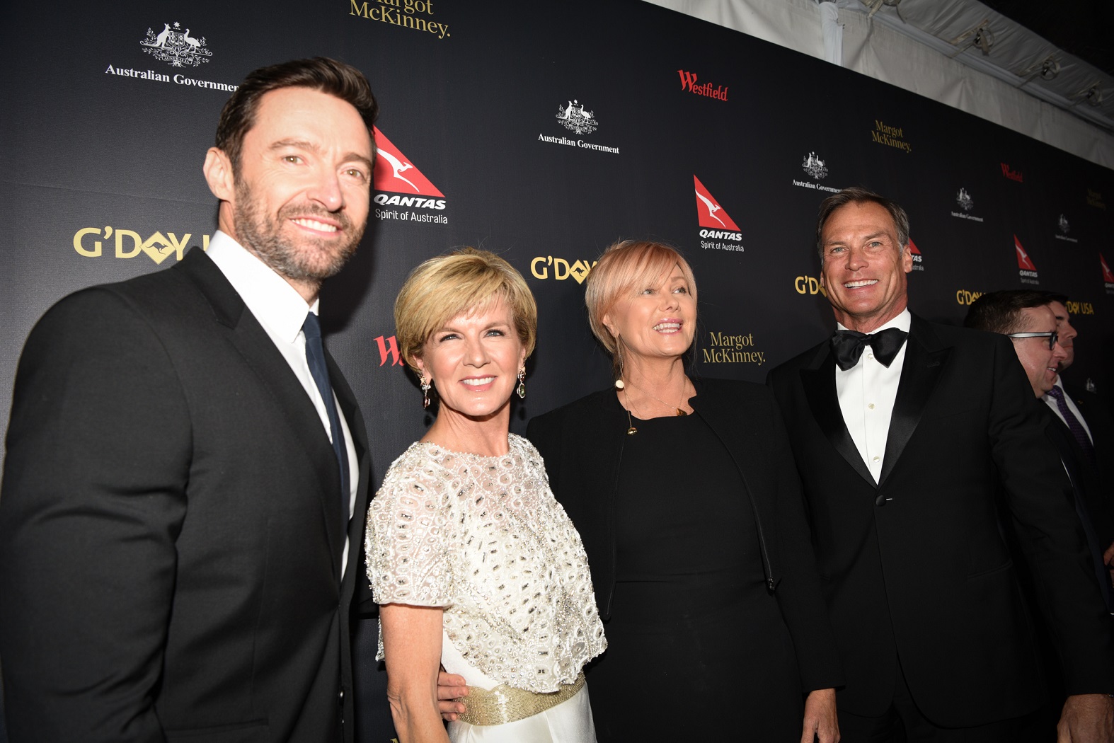 Foreign Minister Julie Bishop alongside actor and former G’Day USA Honoree Hugh Jackman, Deborah-Lee Furness and David Panton on the red carpet at the G’Day USA Gala in Los Angeles on January 28.