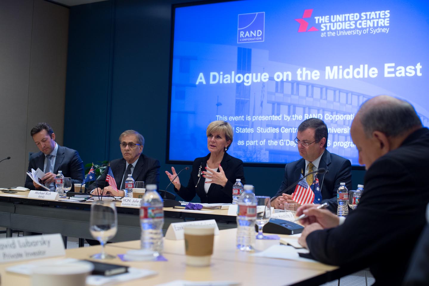 Foreign Minister Julie Bishop delivering remarks on Iran, Violent Extremism and US-Australian cooperation in the Middle East at the G’Day USA/USSC Foreign Policy Roundtable at RAND Corporation in Los Angeles on January 29.